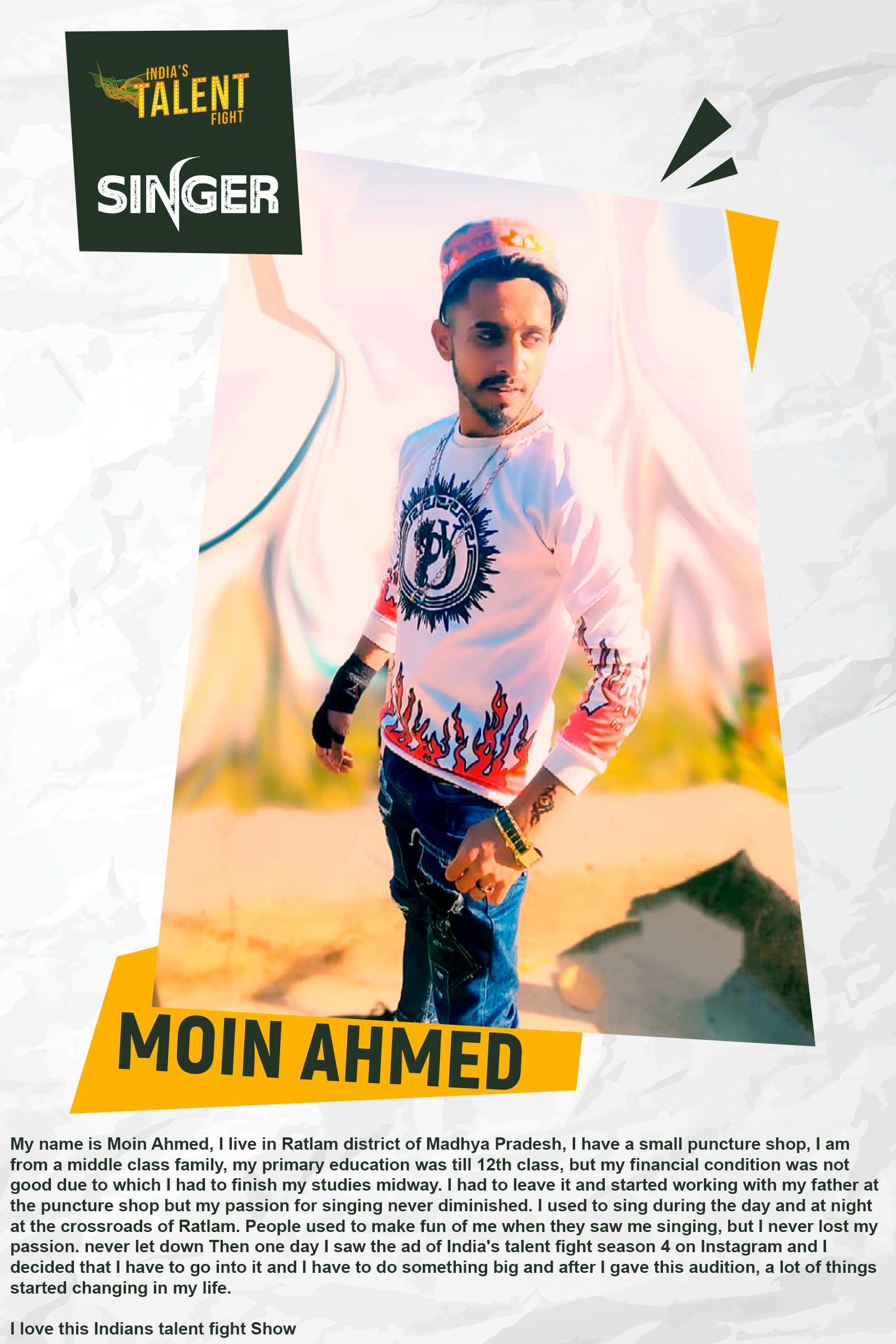 SINGER MOIN AHMED RATLAMMy name is Moin Ahmed, I live in Ratlam district of Madhya Pradesh, I have a small puncture shop, I am from a middle class family, my primary education was till 12th class, but my financial condition was not good due to which I had to finish my studies midway. I had to leave it and started working with my father at the puncture shop but my passion for singing never diminished.