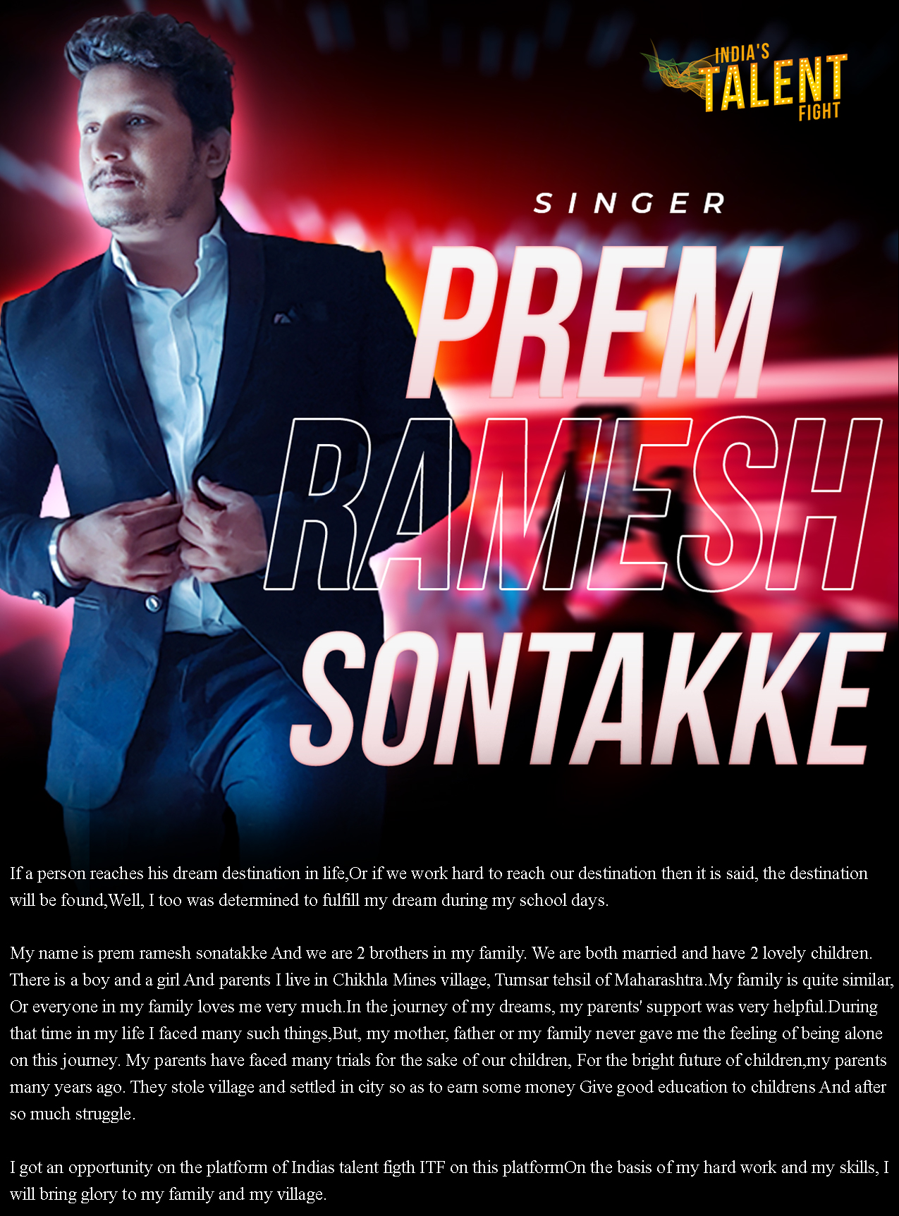 SINGER PREM RAMESH SONTAKKE TUMSARIf a person reaches his dream destination in life,Or if we work hard to reach our destination then it is said, the destination will be found,Well, I too was determined to fulfill my dream during my school daysmy name is prem ramesh sonatakkeAnd we are 2 brothers in my familyWe are both married and have 2 lovely children.There is a boy and a girlAnd parentsI live in Chikhla Mines village, Tumsar
