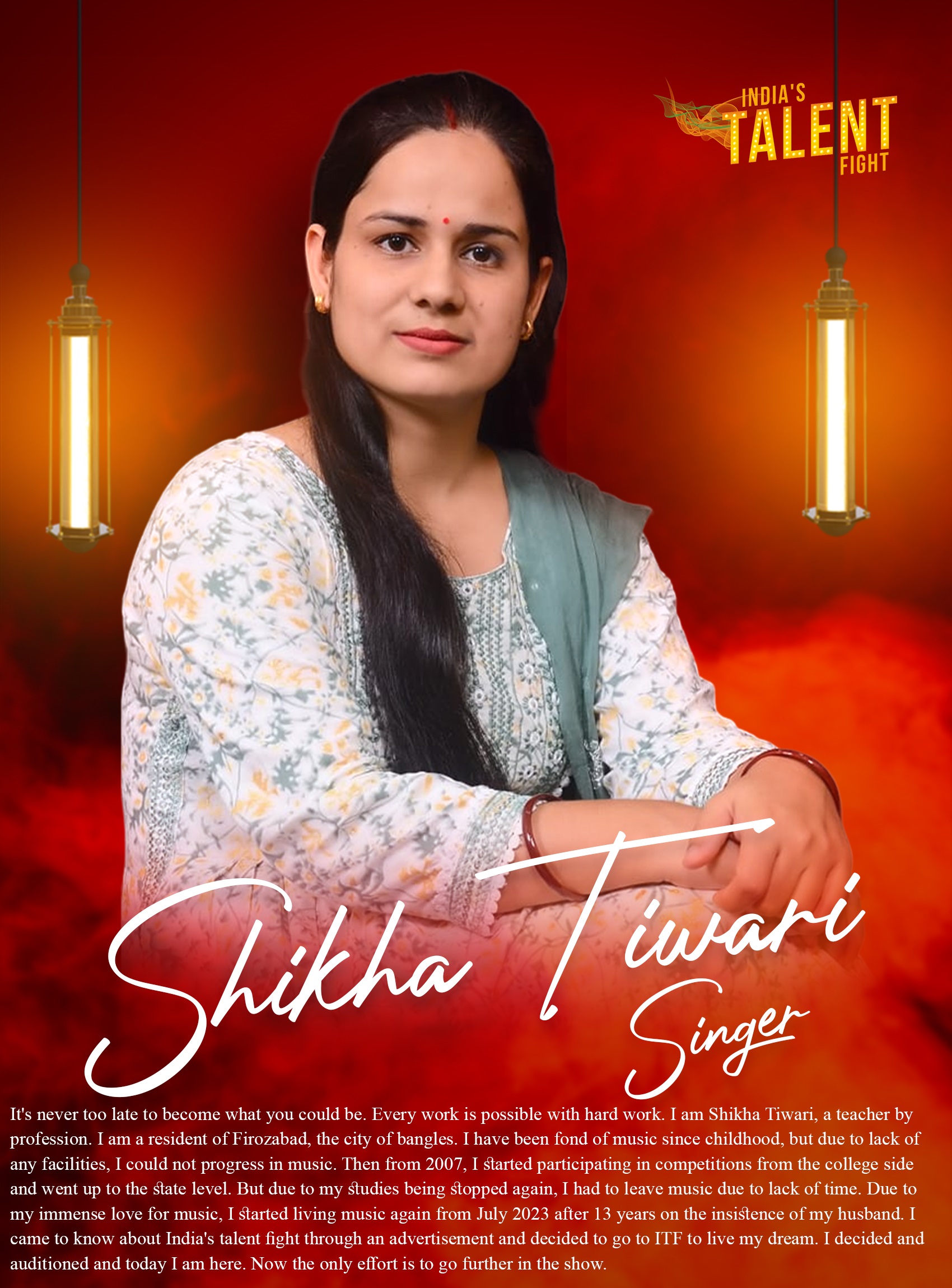 SINGER SHIKHA TIWARI FIROZABADIt’s never too late to become what you could be. Every work is possible with hard work. I am Shikha Tiwari, a teacher by profession. I am a resident of Firozabad, the city of bangles. I have been fond of music since childhood, but due to lack of any facilities, I could not progress in music. Then from 2007, I started participating in competitions from the college side and went up to