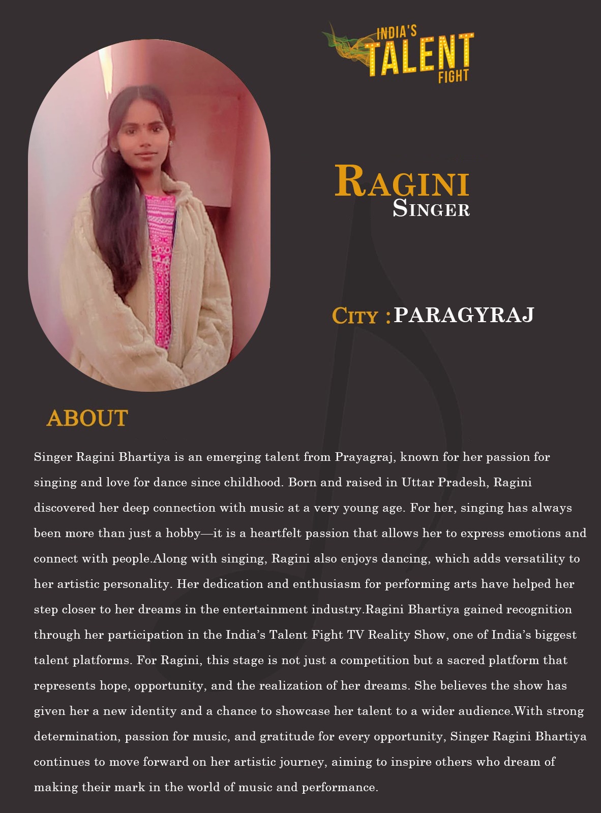 ITF Singer Ragini ParagyrajSinger Ragini Bhartiya is an emerging talent from Prayagraj, known for her passion for singing and love for dance since childhood. Born and raised in Uttar Pradesh, Ragini discovered her deep connection with music at a very young age. For her, singing has always been more than just a hobby—it is a heartfelt passion that allows her to express emotions and connect with people.Along with singing, Ragini also enjoys dancing, which adds