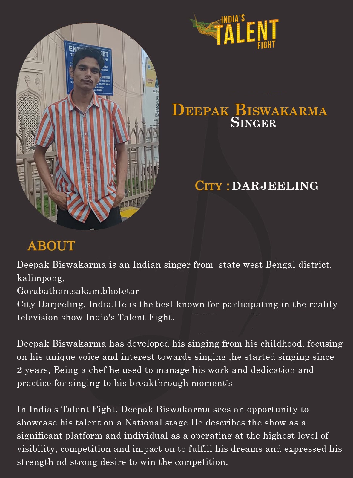 ITF Singer Deepak Biswakarma DarjeelingDeepak Biswakarma is an Indian singer from state west Bengal district, kalimpong,Gorubathan.sakam.bhotetarCity Darjeeling, India.He is the best known for participating in the reality television show India’s Talent Fight.Deepak Biswakarma has developed his singing from his childhood, focusing on his unique voice and interest towards singing ,he started singing since 2 years, Being a chef he used to manage his work and dedication and practice for singing to his breakthrough moment’sIn India’s