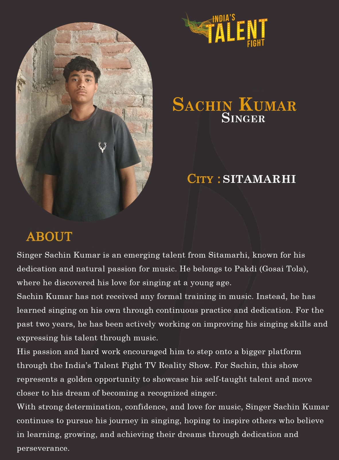 ITF Singer Sachin kumar SitamarhiSinger Sachin Kumar is an emerging talent from Sitamarhi, known for his dedication and natural passion for music. He belongs to Pakdi (Gosai Tola), where he discovered his love for singing at a young age.Sachin Kumar has not received any formal training in music. Instead, he has learned singing on his own through continuous practice and dedication. For the past two years, he has been actively working on improving his singing