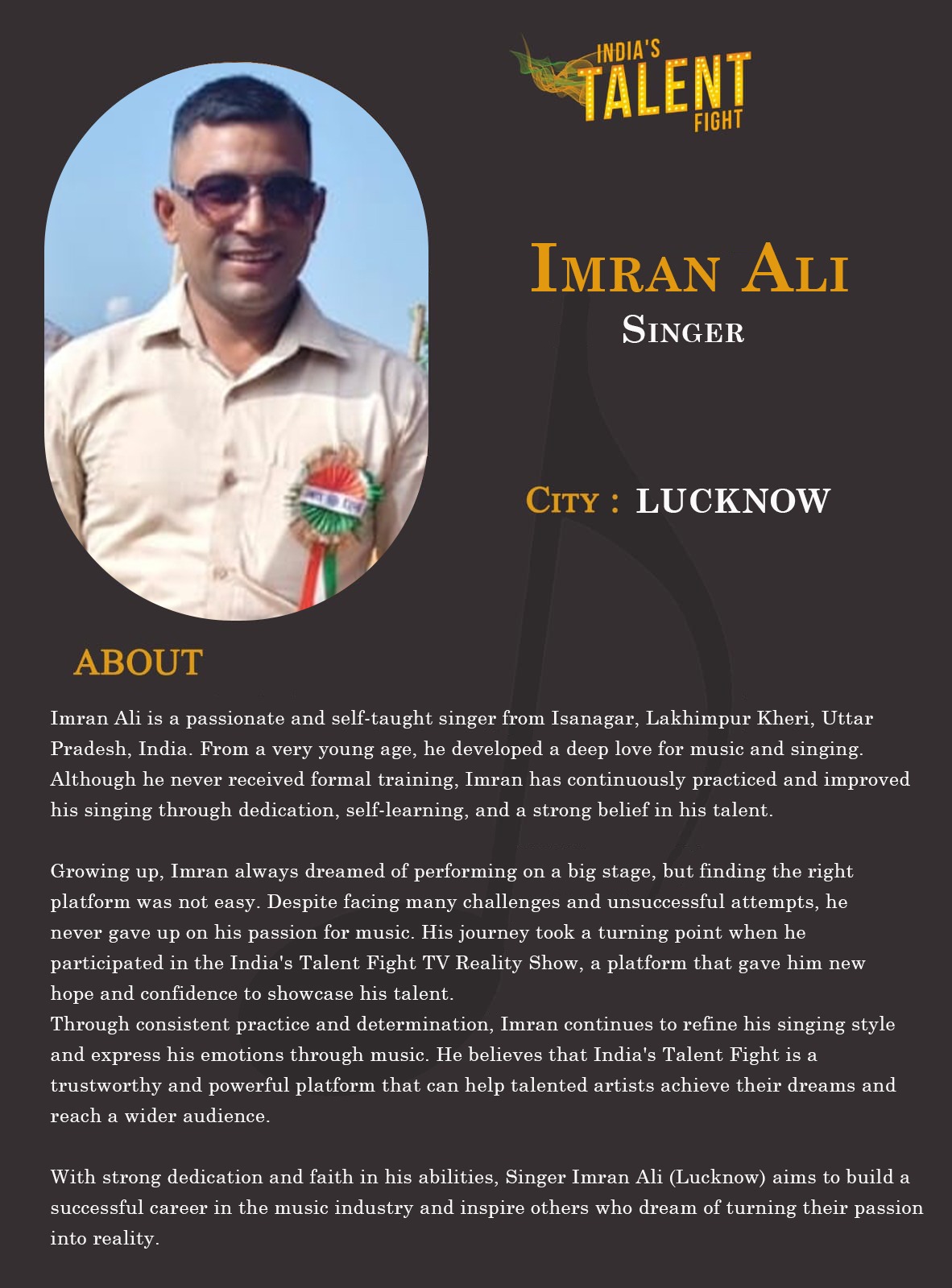 ITF Singer Imran Ali LucknowImran Ali is a passionate and self-taught singer from Isanagar, Lakhimpur Kheri, Uttar Pradesh, India. From a very young age, he developed a deep love for music and singing. Although he never received formal training, Imran has continuously practiced and improved his singing through dedication, self-learning, and a strong belief in his talent.Growing up, Imran always dreamed of performing on a big stage, but finding the right platform was not easy.