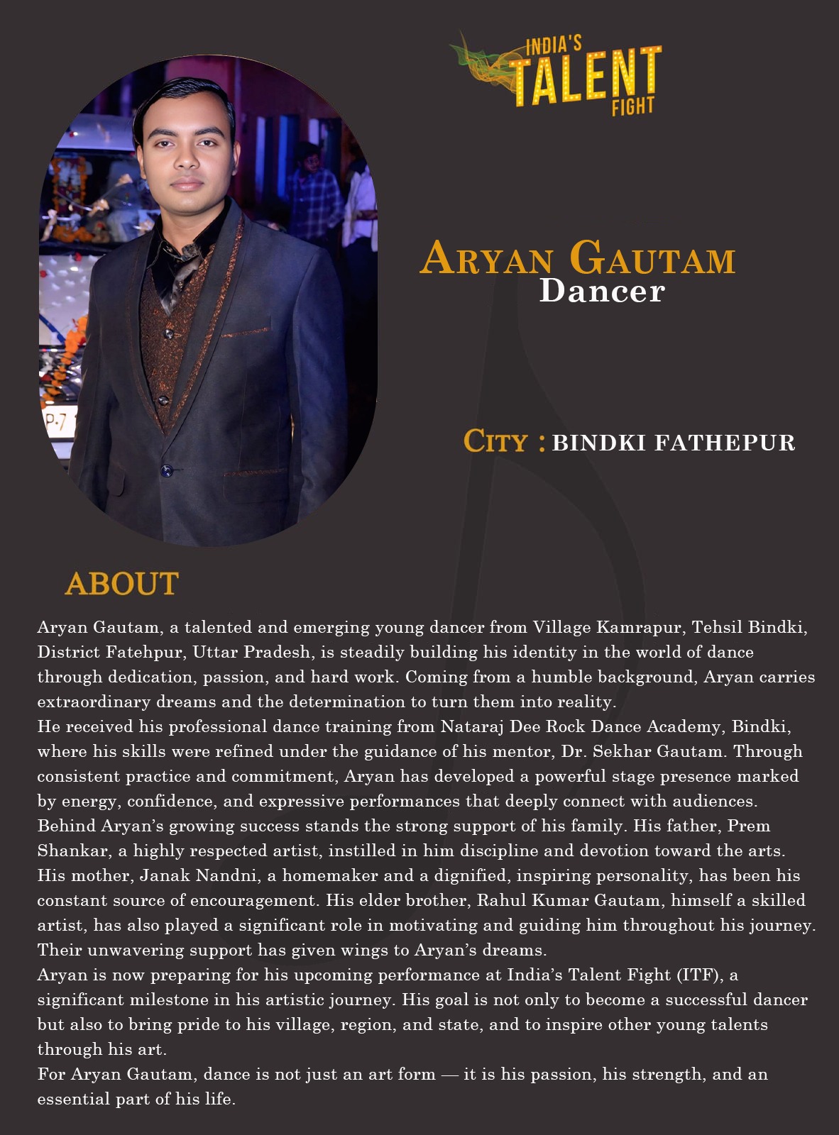ITF Dancer Aryan Gautam Bindki FathepurRahul Gurjar, popularly known as Dancer Rahul Gurjar Bulandshahr, is a passionate self-taught dancer from Pali Anandgarhi village, Post Khanpur, District Bulandshahr, Uttar Pradesh, India. From a very young age, Rahul discovered his deep love for dance. Without any formal training, he developed his own natural style and expression, proving that true talent comes from dedication, passion, and self-belief.Growing up in a small village, Rahul continued practicing dance purely through