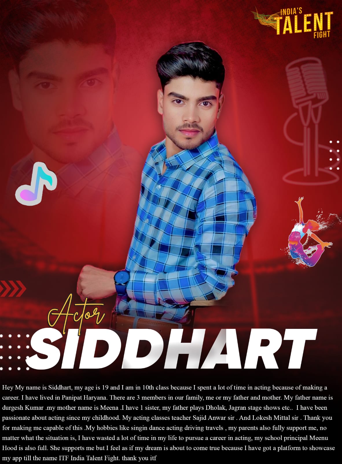 Actor Siddhart PanipatHi,Hey My name is Siddhart, my age is 19 and I am in 10th class because I spent a lot of time in acting because of making a career. I have lived in Panipat Haryana. There are 3 members in our family, me or my father and mother. My father name is durgesh Kumar .my mother name is Meena .I have 1 sister, my father plays Dholak, Jagran stage shows etc.. I have