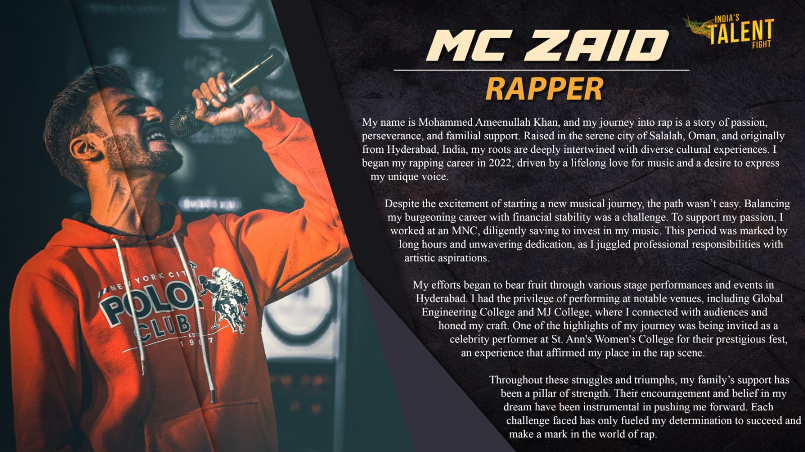 Rapper MC Zaid HyderabadMy name is Mohammed Ameenullah Khan, and my journey into rap is a story of passion, perseverance, and familial support. Raised in the serene city of Salalah, Oman, and originally from Hyderabad, India, my roots are deeply intertwined with diverse cultural experiences. I began my rapping career in 2022, driven by a lifelong love for music and a desire to express my unique voice.Despite the excitement of starting a new musical journey,