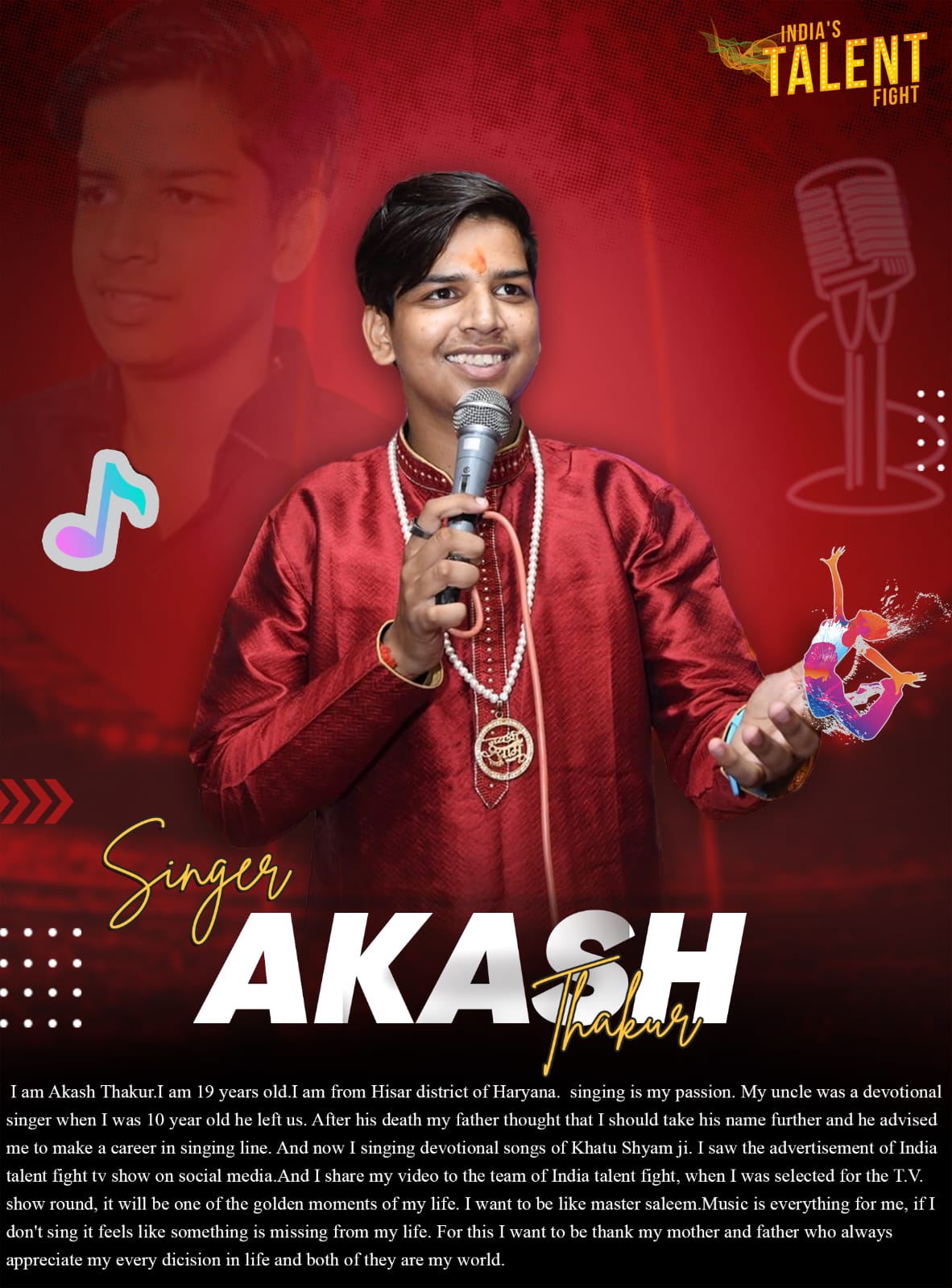 Singer Akash Thakur HisarHi,I am Akash Thakur.I am 19 years old.I am from Hisar district of Haryana. singing is my passion. My uncle was a devotional singer when I was 10 year old he left us. After his death my father thought that I should take his name further and he advised me to make a career in singing line. And now I singing devotional songs of Khatu Shyam ji. I saw the advertisement of