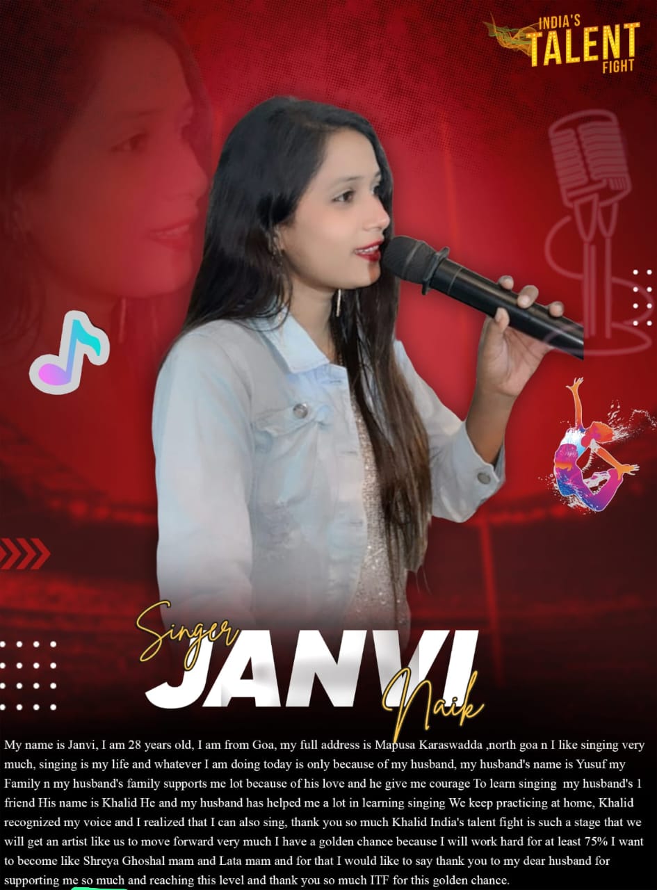 Singer Janvi Naik GoaHi,My name is Janvi, I am 28 years old, I am from Goa, my full address is Mapusa Karaswadda ,north goa n I like singing very much, singing is my life and whatever I am doing today is only because of my husband, my husband’s name is Yusuf my Family n my husband’s family supports me lot because of his love and he give me courage To learn singing my husband’s 1