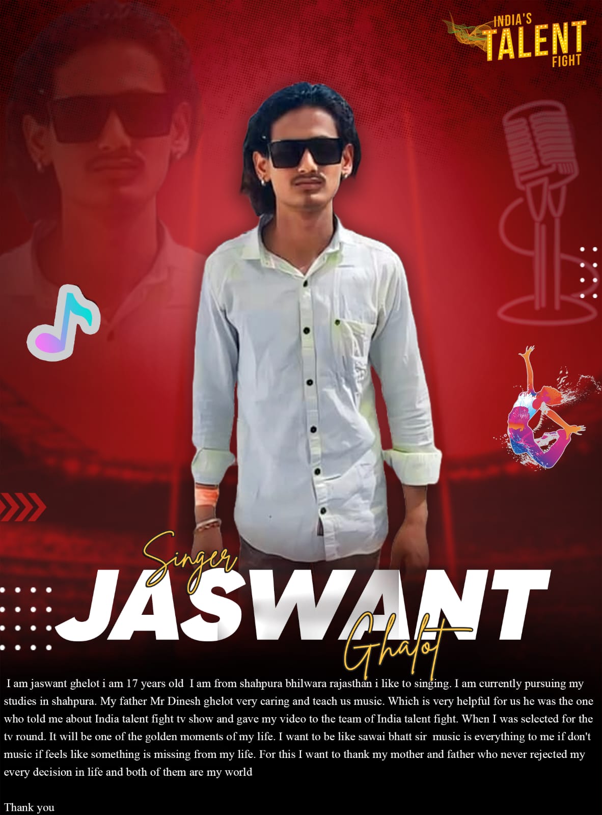 Singer Jaswant Ghalot Shahpur BhilwaraHi,I am jaswant ghelot i am 17 years oldI am from shahpura bhilwara rajasthan i like to singing. I am currently pursuing my studies in shahpura. My father Mr Dinesh ghelot very caring and teach us music. Which is very helpful for us he was the one who told me about India talent fight tv show and gave my video to the team of India talent fight. When I was selected
