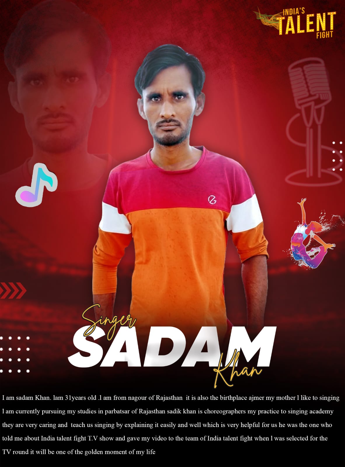 Singer Sadam Khan NagourHi,I am sadam Khan. lam 31years old .l am from nagour of Rajasthan it is also the birthplace ajmer my mother l like to singing l am currently pursuing my studies in parbatsar of Rajasthan sadik khan is choreographers my practice to singing academy they are very caring and teach us singing by explaining it easily and well which is very helpful for us he was the one who told me about