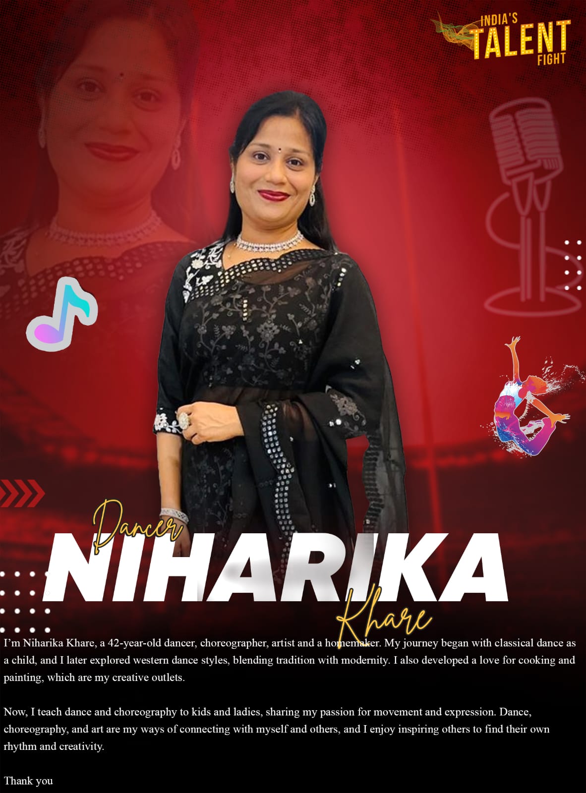 Dancer Niharika Khare BhopalI’m Niharika Khare, a 42-year-old dancer, choreographer, artist and a homemaker. My journey began with classical dance as a child, and I later explored western dance styles, blending tradition with modernity. I also developed a love for cooking and painting, which are my creative outlets.Now, I teach dance and choreography to kids and ladies, sharing my passion for movement and expression. Dance, choreography, and art are my ways of connecting with myself