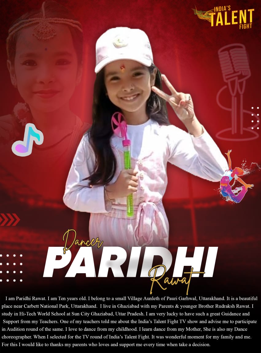 Dancer Paridhi Rawat GarhwalHi,I am Paridhi Rawat. I am Ten years old. I belong to a small Village Aunleth of Pauri Garhwal, Uttarakhand. It is a beautiful place near Carbett National Park, Uttarakhand. I live in Ghaziabad with my Parents & younger Brother Rudraksh Rawat. I study in Hi-Tech World School at Sun City Ghaziabad, Uttar Pradesh. I am very lucky to have such a great Guidance and Support from my Teachers. One of my