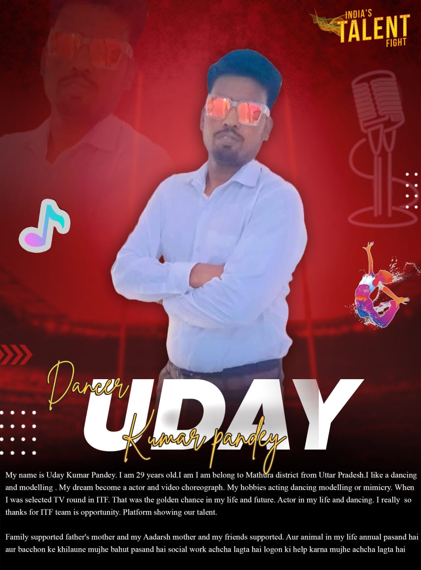 Dancer Uday Kumar pandey MathuraHelloMy name is Uday Kumar Pandey. I am 29 years old.I am I am belong to Mathura district from Uttar Pradesh.I like a dancing and modelling . My dream become a actor and video choreograph. My hobbies acting dancing modelling or mimicry. When I was selected TV round in ITF. That was the golden chance in my life and future. Actor in my life and dancing. I really so thanks for