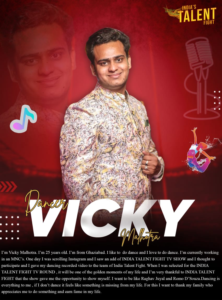 Dancer Vicky Malhotra GhaziabadI’m Vicky Malhotra. I’m 25 years old. I’m from Ghaziabad. I like to do dance and I love to do dance. I’m currently working in an MNC’s. One day I was scrolling Instagram and I saw an add of INDIA TALENT FIGHT TV SHOW and I thought to participate and I gave my dancing recorded video to the team of India Talent Fight. When I was selected for the INDIA TALENT FIGHT