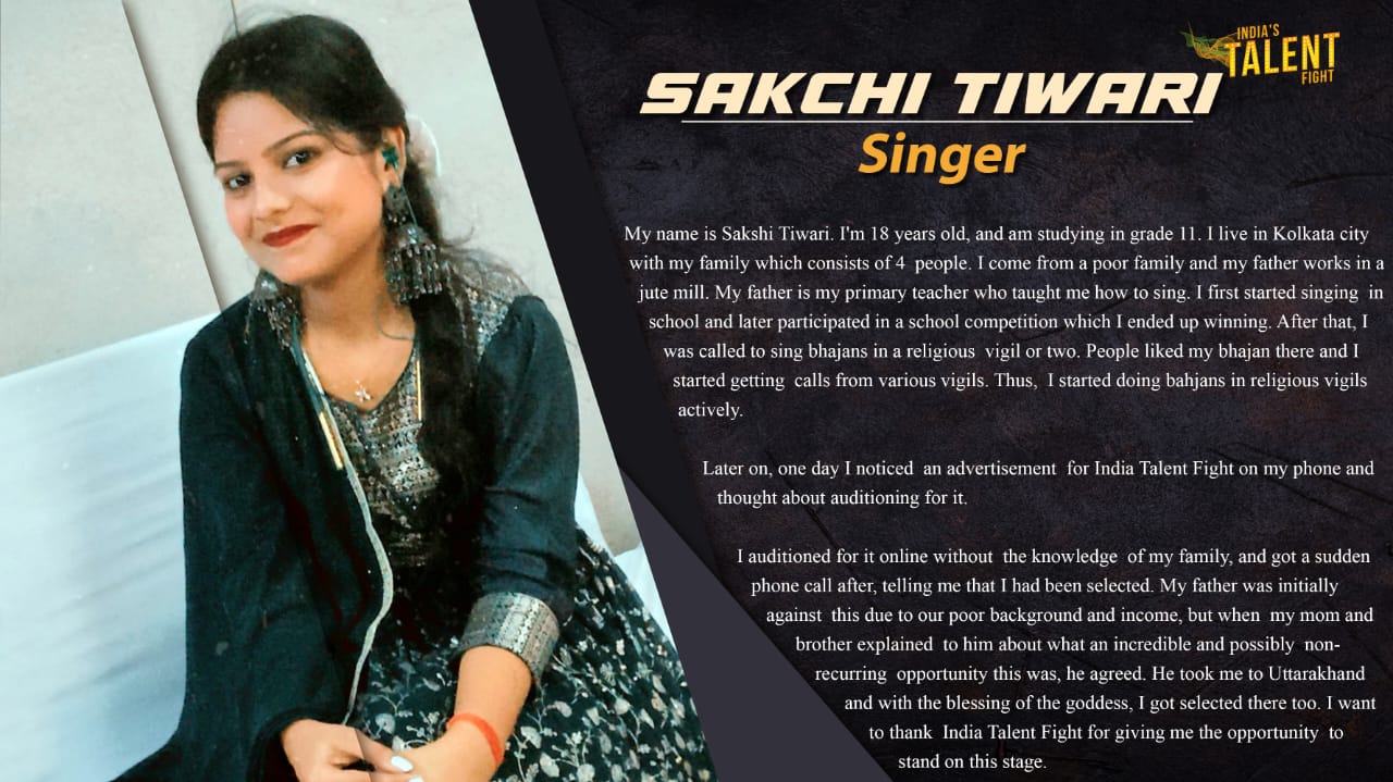 Singer Sakchi Tiwari RishraMy name is Sakshi Tiwari. I’m 18 years old, and am studying in grade 11. I live in Kolkata city with my family which consists of 4 people. I come from a poor family and my father works in a jute mill. My father is my primary teacher who taught me how to sing. I first started singing in school and later participated in a school competition which I ended up winning.