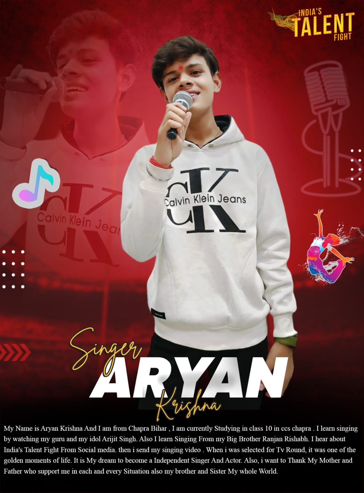 Singer Aryan Krishna chapraMy Name is Aryan Krishna And I am from Chapra Bihar , I am currently Studying in class 10 in ccs chapra . I learn singing by watching my guru and my idol Arijit Singh. Also I learn Singing From my Big Brother Ranjan Rishabh. I hear about India’s Talent Fight From Social media. then i send my singing video . When i was selected for Tv Round, it was one of