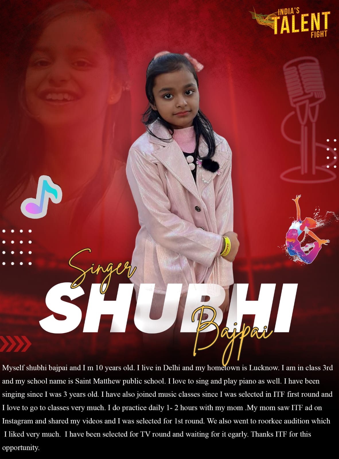 Singer Shubhi Bajpai DelhiMyself shubhi bajpai and I m 10 years old. I live in Delhi and my hometown is Lucknow. I am in class 3rd and my school name is Saint Matthew public school. I love to sing and play piano as well. I have been singing since I was 3 years old. I have also joined music classes since I was selected in ITF first round and I love to go to classes