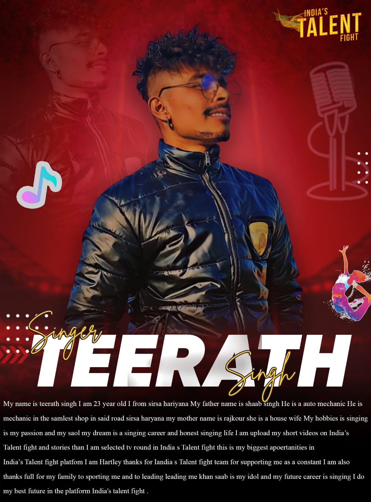 Singer Teerath Singh SirsaMy name is teerath singh I am 23 year old I from sirsa hariyana My father name is shaab singh He is a auto mechanic He is mechanic in the samlest shop in said road sirsa haryana my mother name is rajkour she is a house wife My hobbies is singing is my passion and my saol my dream is a singing career and honest singing life I am upload my short