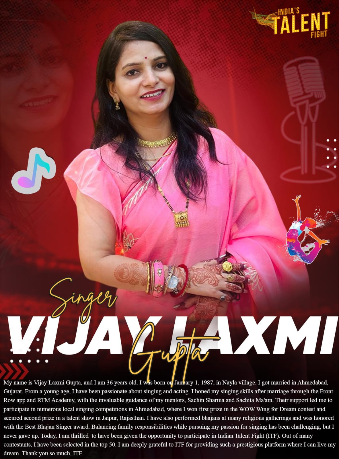 Singer Vijay laxmi gupta AhmedabadMy name is Vijay Laxmi Gupta, and I am 36 years old. I was born on January 1, 1987, in Nayla village. I got married in Ahmedabad, Gujarat. From a young age, I have been passionate about singing and acting. I honed my singing skills after marriage through the Front Row app and RTM Academy, with the invaluable guidance of my mentors, Sachin Sharma and Sachita Ma’am.Their support led me to