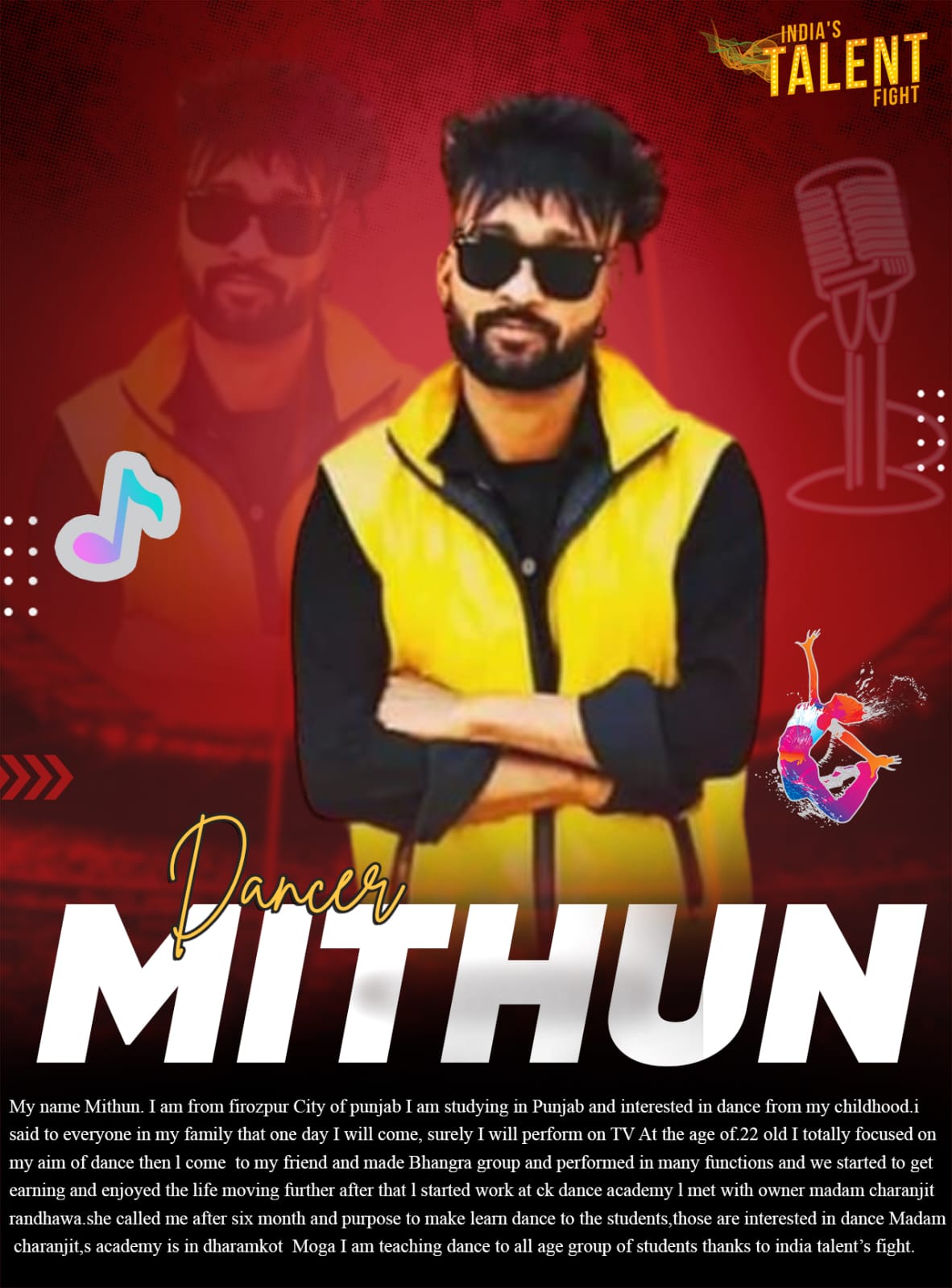 Dancer Mithun FirozpurMy name Mithun. I am from firozpur City of punjab I am studying in Punjab and interested in dance from my childhood.i said to everyone in my family that one day I will come, surely I will perform on TV At the age of.22 old I totally focused on my aim of dance then l come to my friend and made Bhangra group and performed in many functions and we started to get