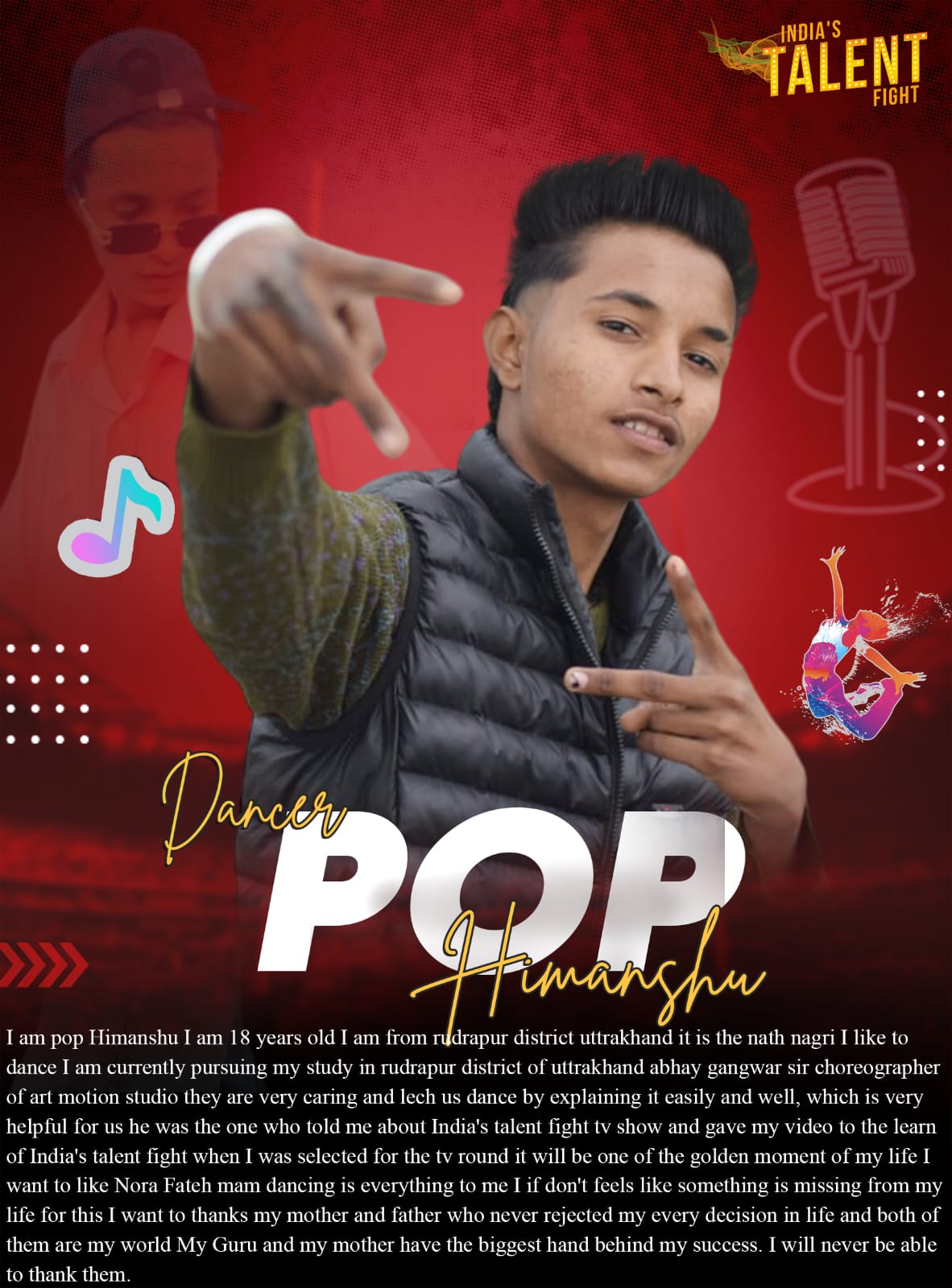 Dancer Pop Himanshu RudrapurI am pop Himanshu I am 18 years old I am from rudrapur district uttrakhand it is the nath nagri I like to dance I am currently pursuing my study in rudrapur district of uttrakhand abhay gangwar sir choreographer of art motion studio they are very caring and lech us dance by explaining it easily and well, which is very helpful for us he was the one who told me about India’s