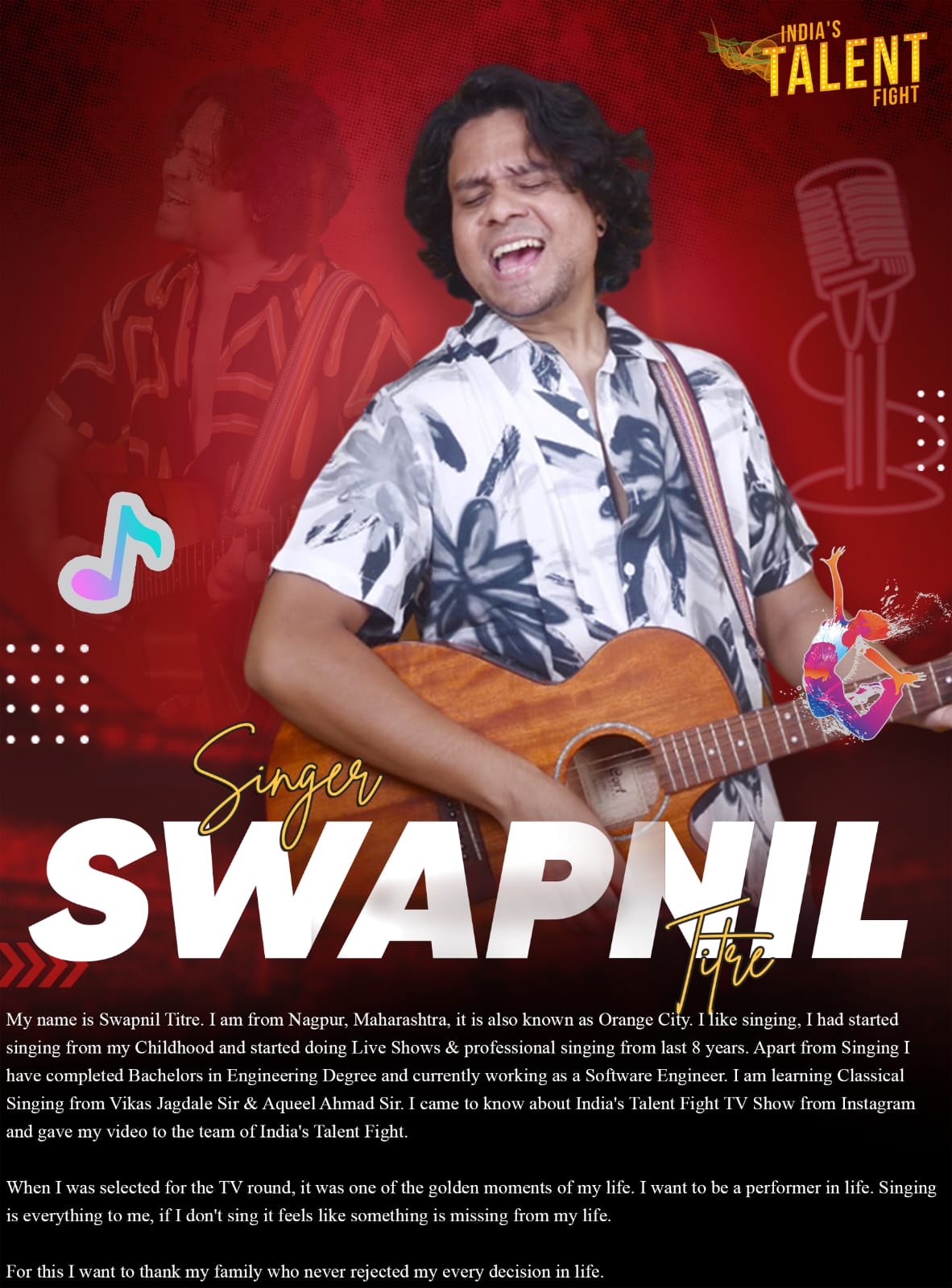 Singer Swapnil Titre NagpurMy name is Swapnil Titre. I am from Nagpur, Maharashtra, it is also known as Orange City.I like singing, I had started singing from my Childhood and started doing Live Shows & professional singing from last 8 years.Apart from Singing I have completed Bachelors in Engineering Degree and currently working as a Software Engineer.I am learning Classical Singing from Vikas Jagdale Sir & Aqueel Ahmad Sir. I came to know about India’s