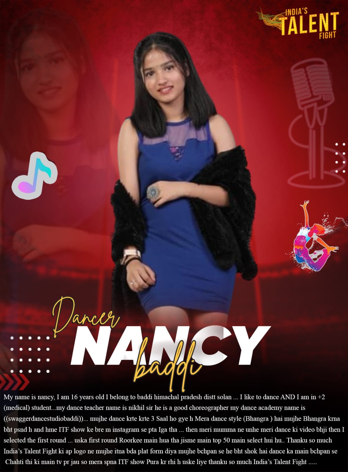 Dancer Nancy baddi SolanMy name is nancy, I am 16 years old I belong to baddi himachal pradesh distt solan … I like to dance AND I am in +2(medical) student…my dance teacher name is nikhil sir he is a good choreographer my dance academy name is ((swaggerdancestudiobaddi))… mujhe dance krte krte 3 Saal ho gye h Mera dance style (Bhangra ) hai mujhe Bhangra krna bht psnd h and hme ITF show ke bre