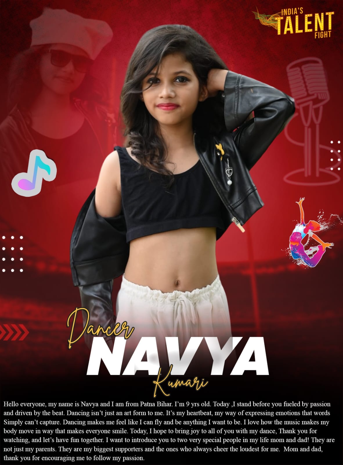 Dancer Navya kumari PatnaHello everyone, my name is Navya and I am from Patna Bihar. I’m 9 yrs old. Today ,I stand before you fueled by passion and driven by the beat. Dancing isn’t just an art form to me. It’s my heartbeat, my way of expressing emotions that words Simply can’t capture.Dancing makes me feel like I can fly and be anything I want to be. I love how the music makes my body
