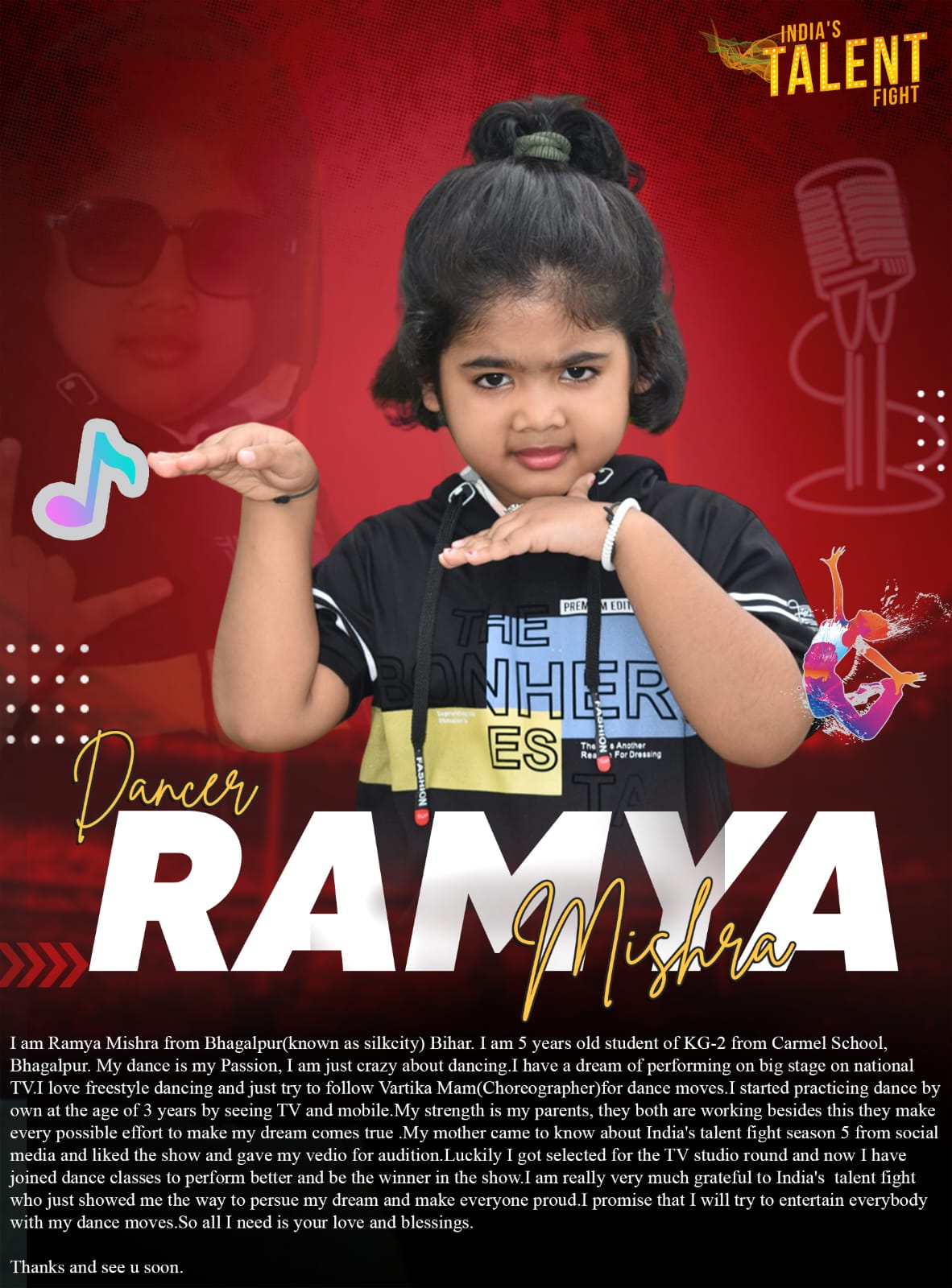 Dancer Ramya Mishra BhagalpurHi,I am Ramya Mishra from Bhagalpur(known as silkcity) Bihar. I am 5 years old student of KG-2 from Carmel School, Bhagalpur. My dance is my Passion, I am just crazy about dancing.I have a dream of performing on big stage on national TV.I love freestyle dancing and just try to follow Vartika Mam(Choreographer)for dance moves.I started practicing dance by own at the age of 3 years by seeing TV and mobile.My strength