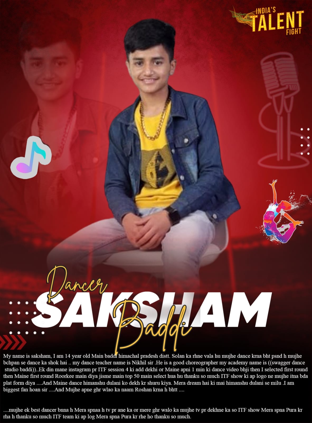 Dancer Saksham Baddi SolanHello everyone………My name is saksham, I am 14 year old Main baddi himachal pradesh distt. Solan ka rhne vala hu mujhe dance krna bht psnd h mujhe bchpan se dance ka shok hai .. my dance teacher name is Nikhil sir .He is a good choreographer my academy name is ((swagger dance studio baddi))..Ek din mane instagram pr ITF session 4 ki add dekhi or Maine apni 1 min ki dance video