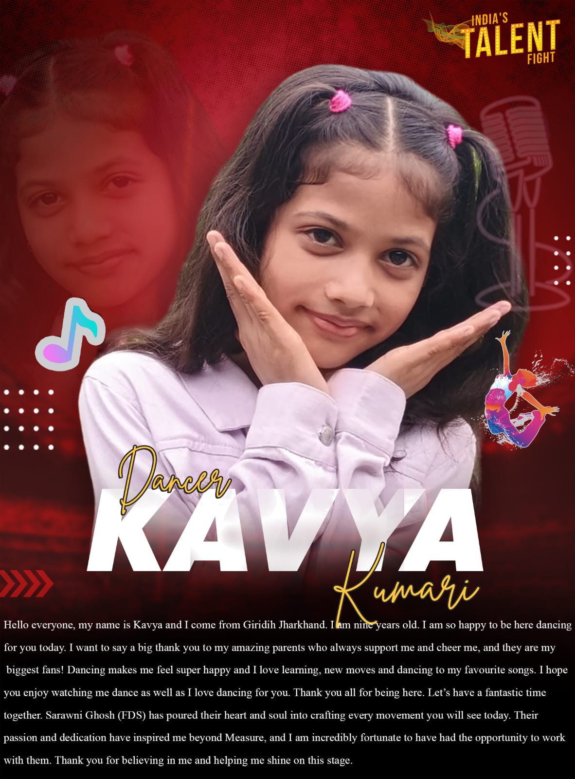 Dancer kavya kumari giridhHello everyone, my name is Kavya and I come from Giridih Jharkhand. I am nine years old. I am so happy to be here dancing for you today. I want to say a big thank you to my amazing parents who always support me and cheer me, and they are my biggest fans! Dancing makes me feel super happy and I love learning, new moves and dancing to my favourite songs. I