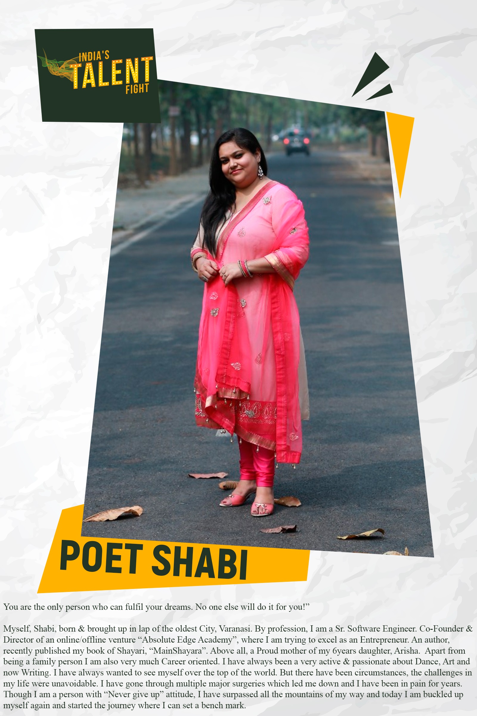 POET SHABI“You are the only person who can fulfil your dreams. No one else will do it for you!”Myself, Shabi, born & brought up in lap of the oldest City, Varanasi. By profession, I am a Sr. Software Engineer. Co-Founder & Director of an online/offline venture “Absolute Edge Academy”, where I am trying to excel as an Entrepreneur. An author, recently published my book of Shayari, “MainShayara”. Above all, a Proud mother of my 6years