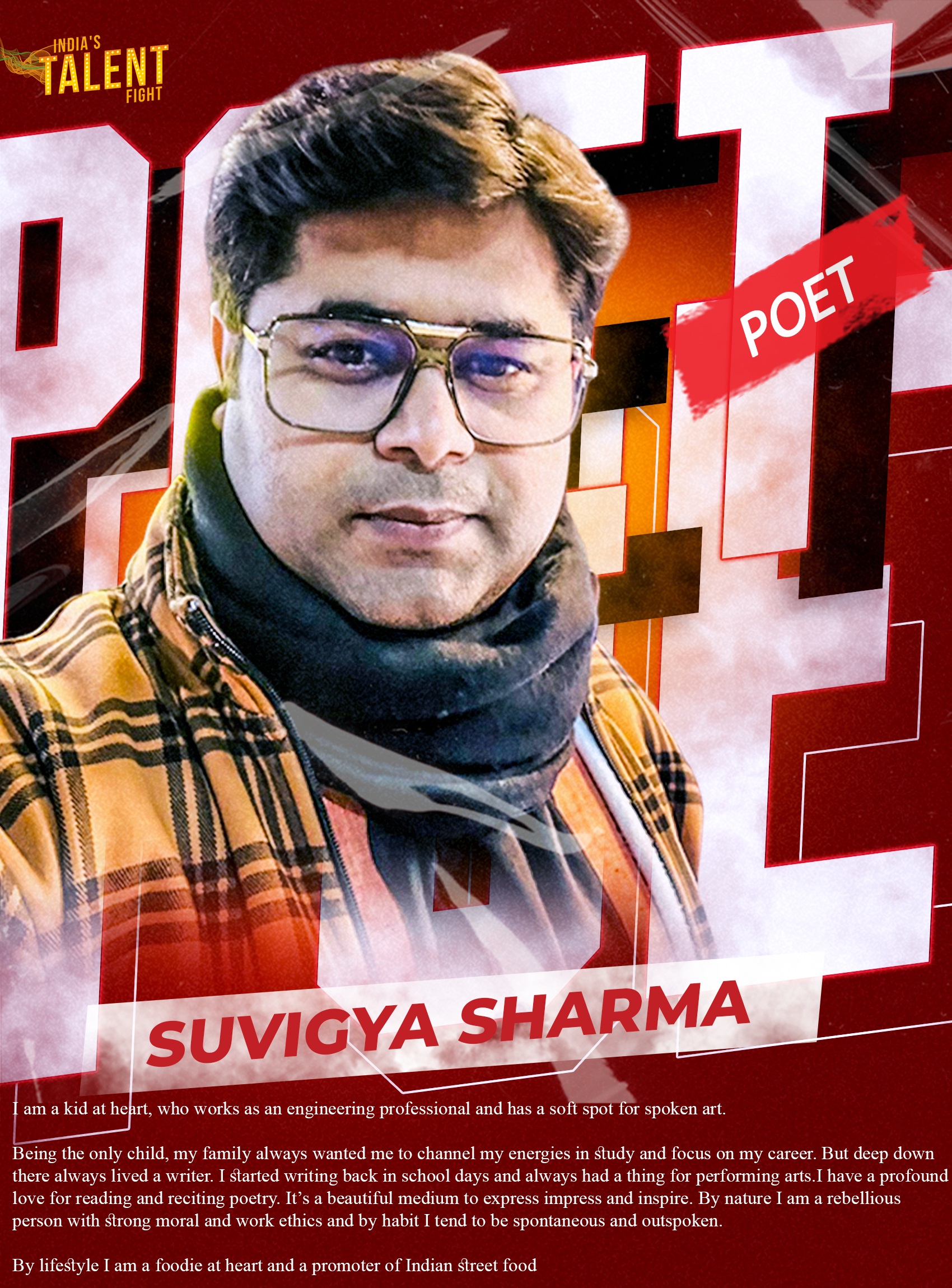 POET SUVIGYA SHARMA NOIDAI am a kid at heart, who works as an engineering professional and has a soft spot for spoken art.Being the only child, my family always wanted me to channel my energies in study and focus on my career. But deep down there always lived a writer. I started writing back in school days and always had a thing for performing arts.I have a profound love for reading and reciting poetry. It’s