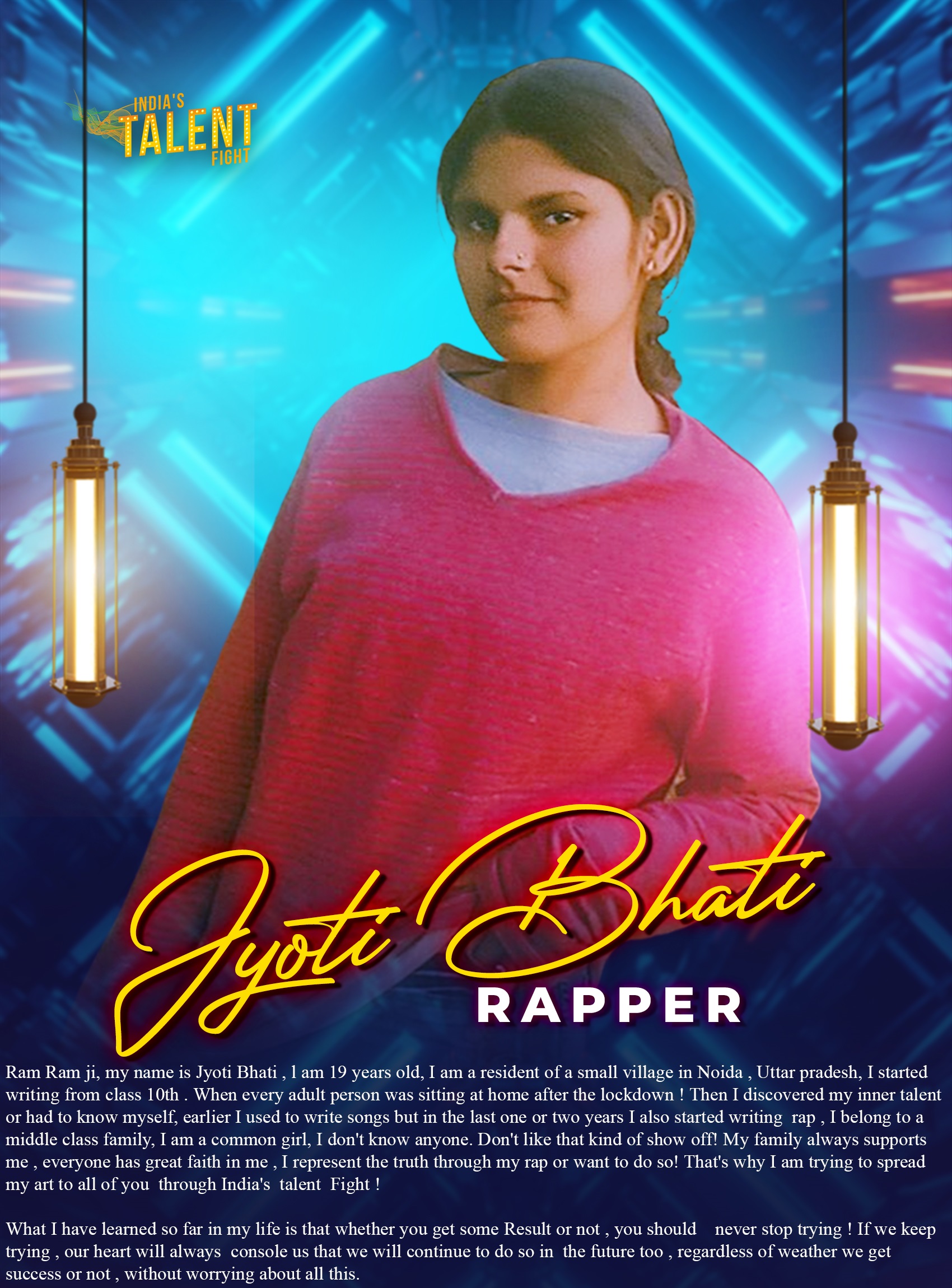 RAPPER JYOTI BHATI NOIDARam Ram ji, my name is Jyoti Bhati , l am 19 years old, I am a resident of a small village in Noida , Uttar pradesh, I started writing from class 10th .When every adult person was sitting at home after the lockdown ! Then I discovered my inner talent or had to know myself, earlier I used to write songs but in the last one or two years I also