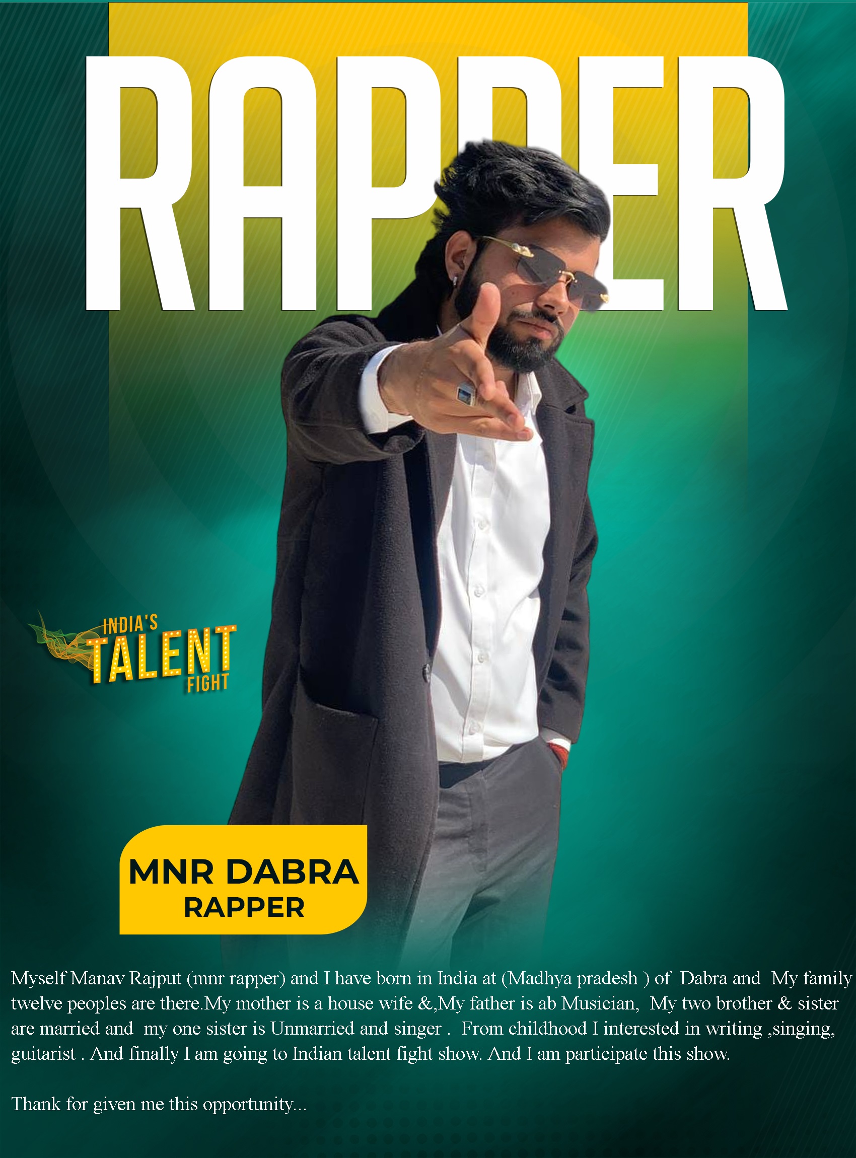 RAPPER MNR DABRAMyself Manav Rajput (mnr rapper) and I have born in India at (Madhya pradesh ) of Dabra and My family twelve peoples are there.My mother is a house wife &,My father is ab Musician, My two brother & sister are married and my one sister is Unmarried and singer . From childhood I interested in writing ,singing, guitarist . And finally I am going to Indian talent fight show. And I am participate