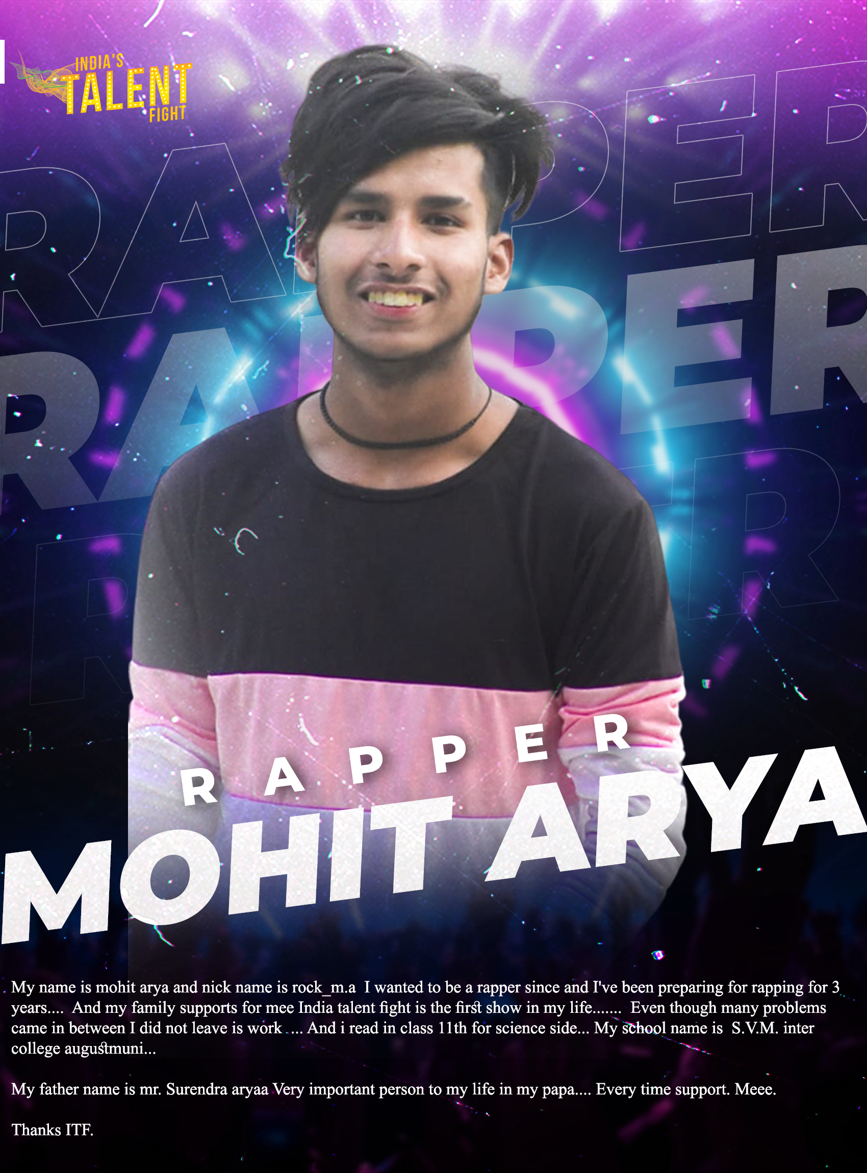 RAPPER MOHIT ARYA RUDRAPRAYAGHello india talent fight….My name is mohit arya and nick name is rock_m.a I wanted to be a rapper since and I’ve been preparing for rapping for 3 years…. And my family supports for meeIndia talent fight is the first show in my life…….Even though many problems came in between I did not leave is work … And i read in class 11th for science side… My school name is S.V.M. inter