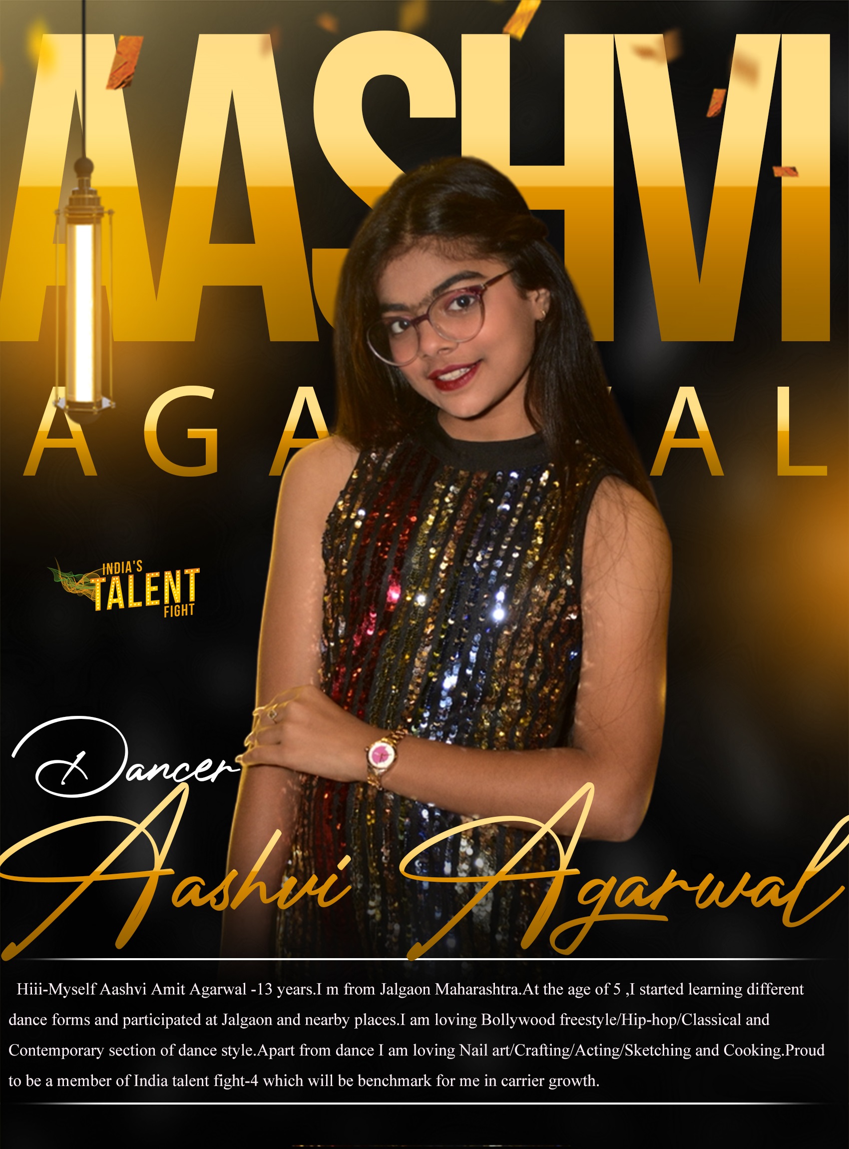 ITF DANCER AASHVI AGARWAL JALGAONHiii-Myself Aashvi Amit Agarwal -13 years.I m from Jalgaon Maharashtra.At the age of 5 ,I started learning different dance forms and participated at Jalgaon and nearby places.I am loving Bollywood freestyle/Hip-hop/Classical and Contemporary section of dance style.Apart from dance I am loving Nail art/Crafting/Acting/Sketching and Cooking.Proud to be a member of India talent fight-4 which will be benchmark for me in carrier growth. ITF Dancing, ITF Season 4 ITF Singer gayatri