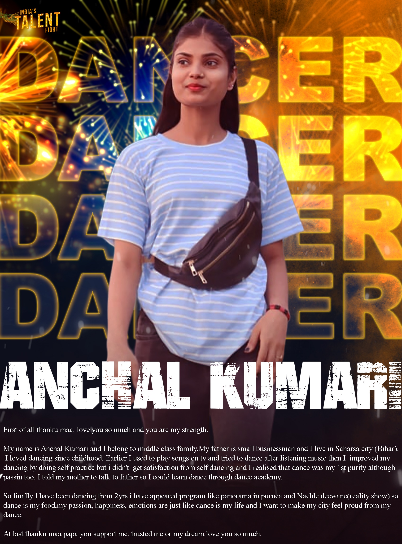 ITF DANCER ANCHAL KUMARI SAHARSAFirst of all thanku maa. love you so much and you are my strength.My name is Anchal Kumari and I belong to middle class family.My father is small businessman and I live in Saharsa city (Bihar).I loved dancing since childhood.Earlier I used to play songs on tv and tried to dance after listening music then I improved my dancing by doing self practice but i didn’t get satisfaction from self dancing
