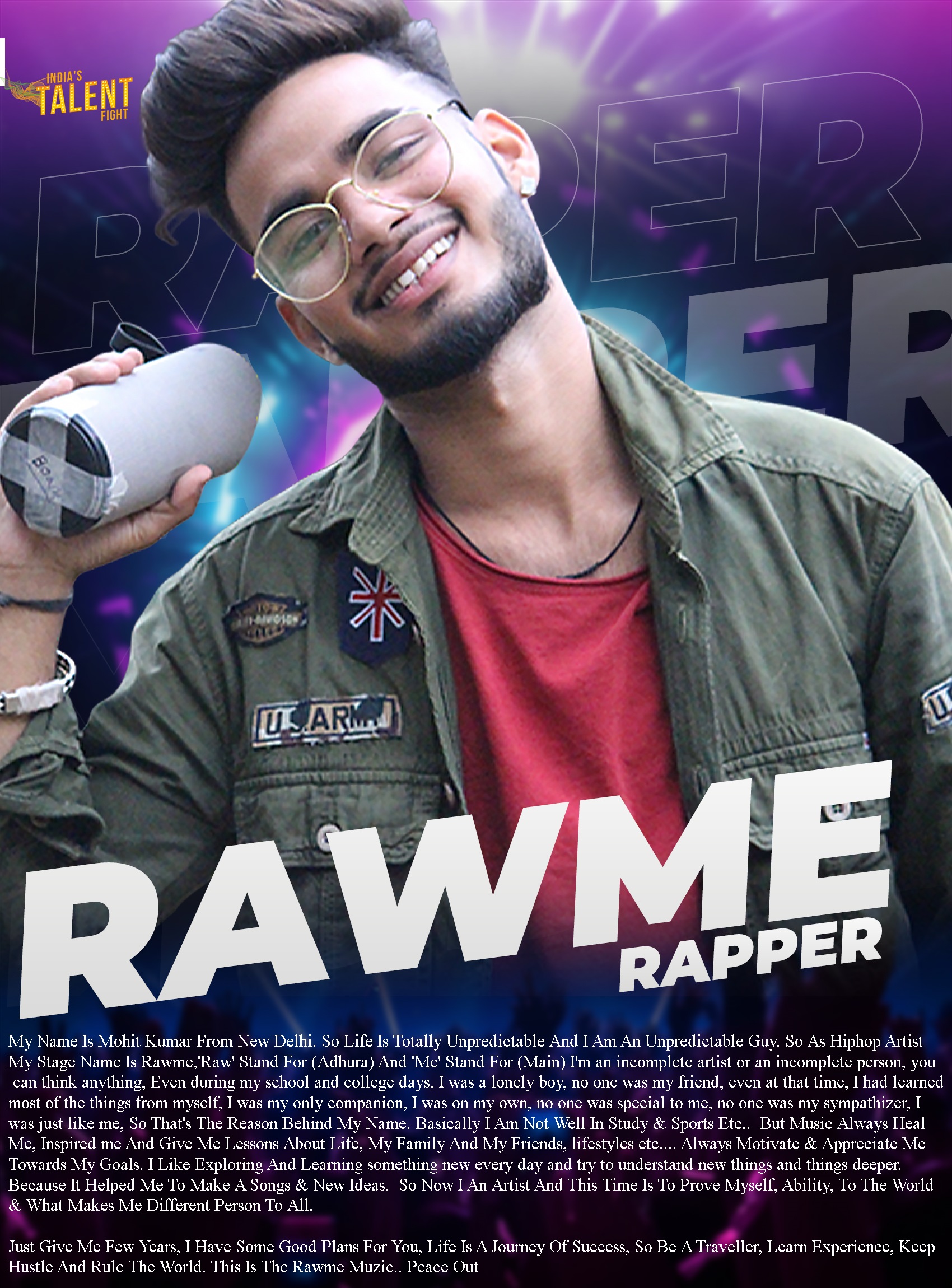 ITF RAPPER RAWME DELHIMy Name Is Mohit Kumar From New Delhi. So Life Is Totally Unpredictable And I Am An Unpredictable Guy.So As Hiphop Artist My Stage Name Is Rawme,‘Raw’ Stand For (Adhura) And ‘Me’ Stand For (Main)I’m an incomplete artist or an incomplete person,you can think anything, Even during my school and college days, I was a lonely boy, no one was my friend, even at that time, I had learned most of the