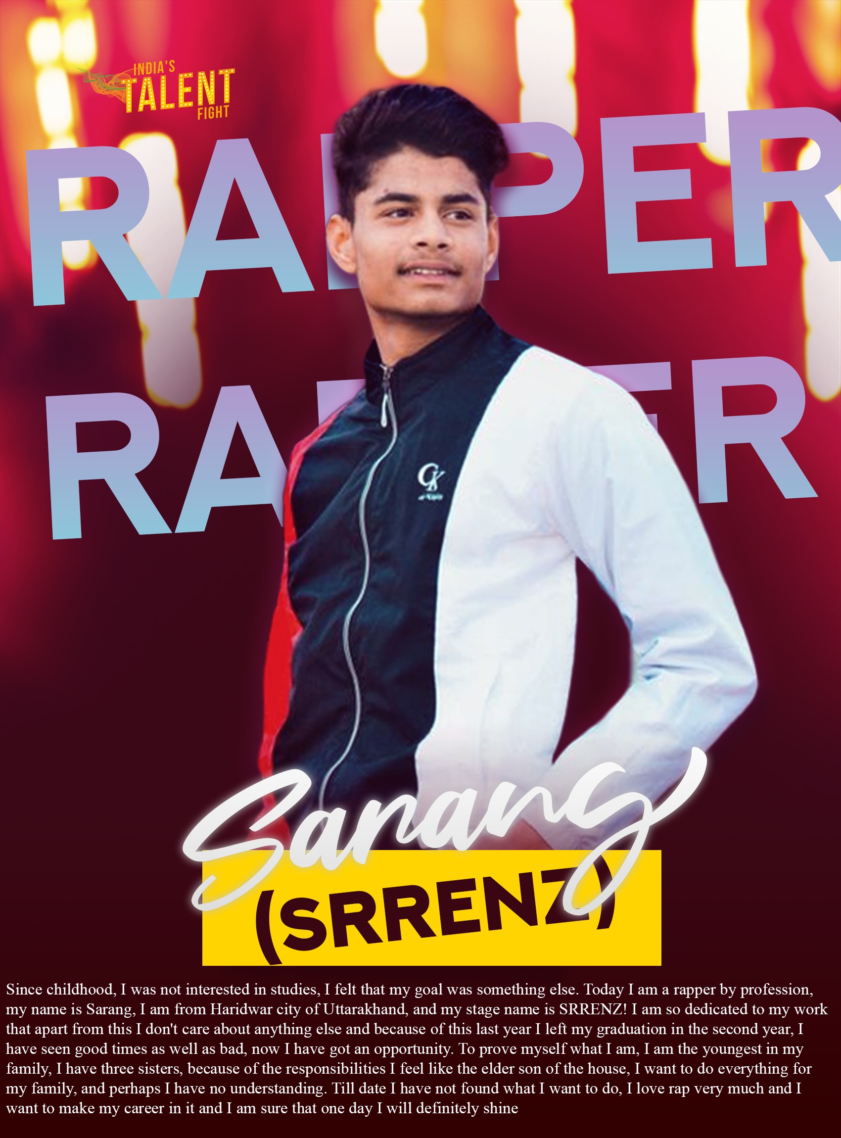 ITF RAPPER SARANG (SRRENZ) HARIDWARHard work and courage is another name for success.Since childhood, I was not interested in studies, I felt that my goal was something else. Today I am a rapper by profession, my name is Sarang, I am from Haridwar city of Uttarakhand, and my stage name is SRRENZ! I am so dedicated to my work that apart from this I don’t care about anything else and because of this last year