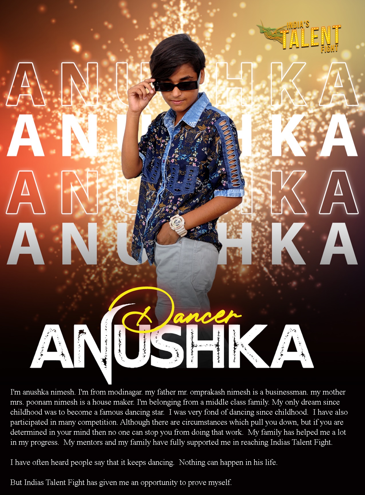 DANCER ANUSHKA MODINAGARI’m anushka nimesh. I’m from modinagar. my father mr. omprakash nimesh is a businessman. my mother mrs. poonam nimesh is a house maker. I’m belonging from a middle class family. My only dream since childhood was to become a famous dancing star. I was very fond of dancing since childhood. I have also participated in many competition. Although there are circumstances which pull you down, but if you are determined in your mind