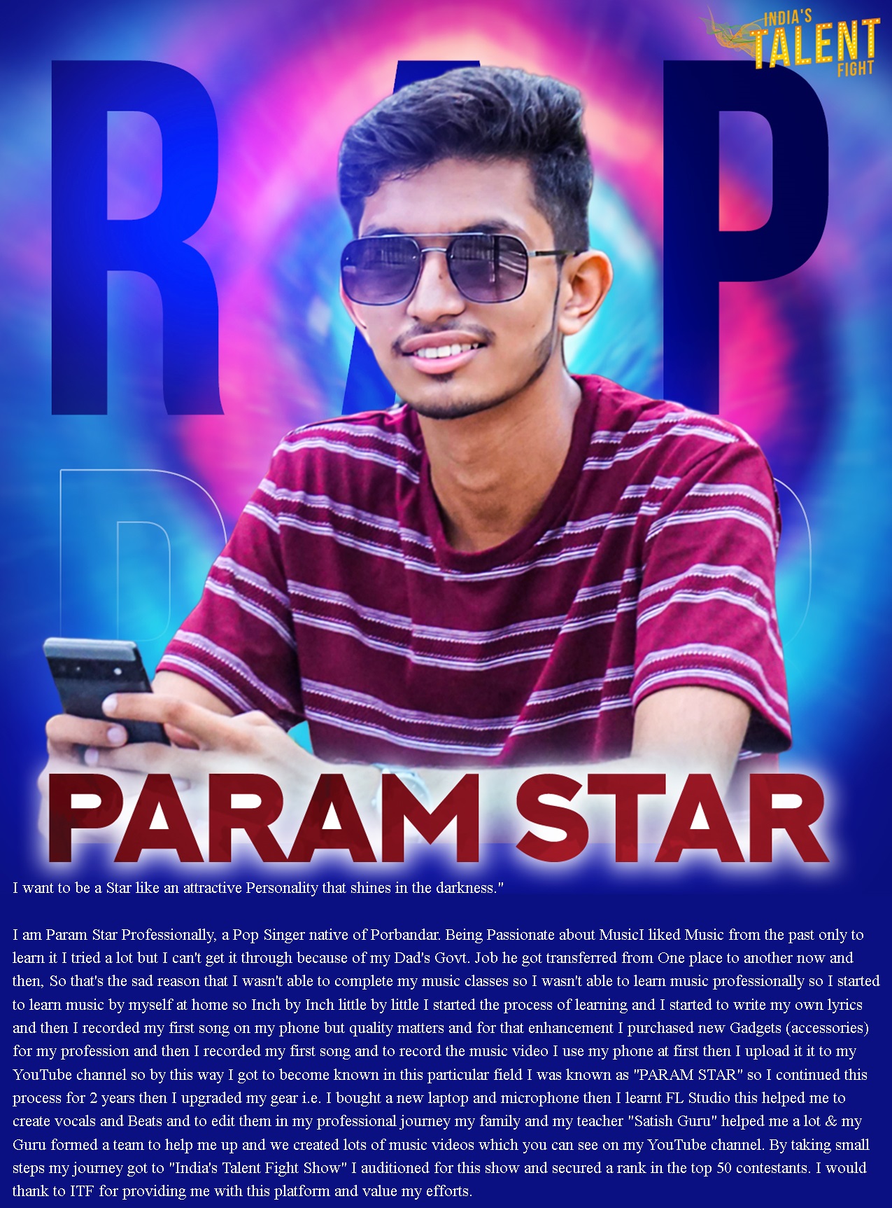 RAPPER PARAM STAR BHUJ.I want to be a Star like an attractive Personality that shines in the darkness.”I am Param Star Professionally, a Pop Singer native of Porbandar. Being Passionate about MusicI liked Music from the past only to learn it I tried a lot but I can’t get it through because of my Dad’s Govt. Job he got transferred from One place to another now and then, So that’s the sad reason that I