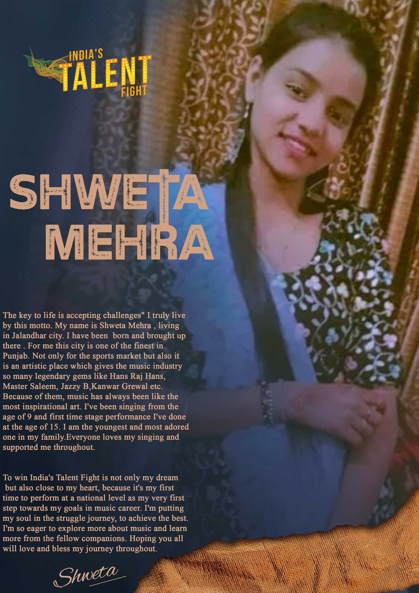 SINGER SHWETA MEHRA JALANDHAR“The key to life is accepting challenges” I truly live by this motto. My name is Shweta Mehra , living in Jalandhar city. I have been born and brought up there . For me this city is one of the finest in Punjab. Not only for the sports market but also it is an artistic place which gives the music industry so many legendary gems like Hans Raj Hans,Master Saleem, Jazzy B,Kanwar