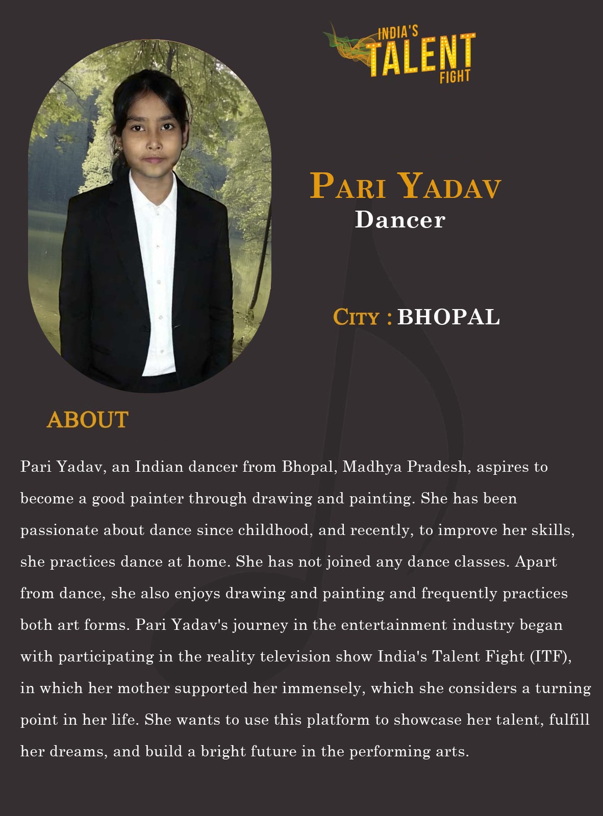 ITF Dancer Pari yadav BhopalPari Yadav, an Indian dancer from Bhopal, Madhya Pradesh, aspires to become a good painter through drawing and painting. She has been passionate about dance since childhood, and recently, to improve her skills, she practices dance at home. She has not joined any dance classes. Apart from dance, she also enjoys drawing and painting and frequently practices both art forms. Pari Yadav’s journey in the entertainment industry began with participating in
