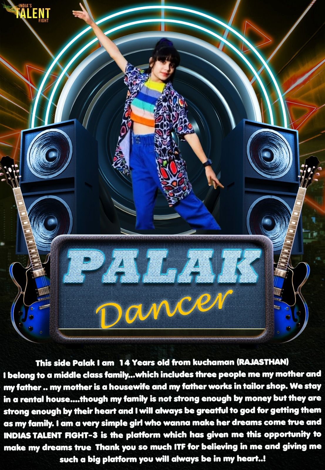 PALAK DANCER KANPURHello everyone out there!This side Palak I am 14 Years old from kuchaman (RAJASTHAN)I belong to a middle class family…which includes three people me my mother and my father .. my mother is a housewife and my father works in tailor shop. We stay in a rental house….though my family is not strong enough by money but they are strong enough by their heart and I will always be greatful to god for
