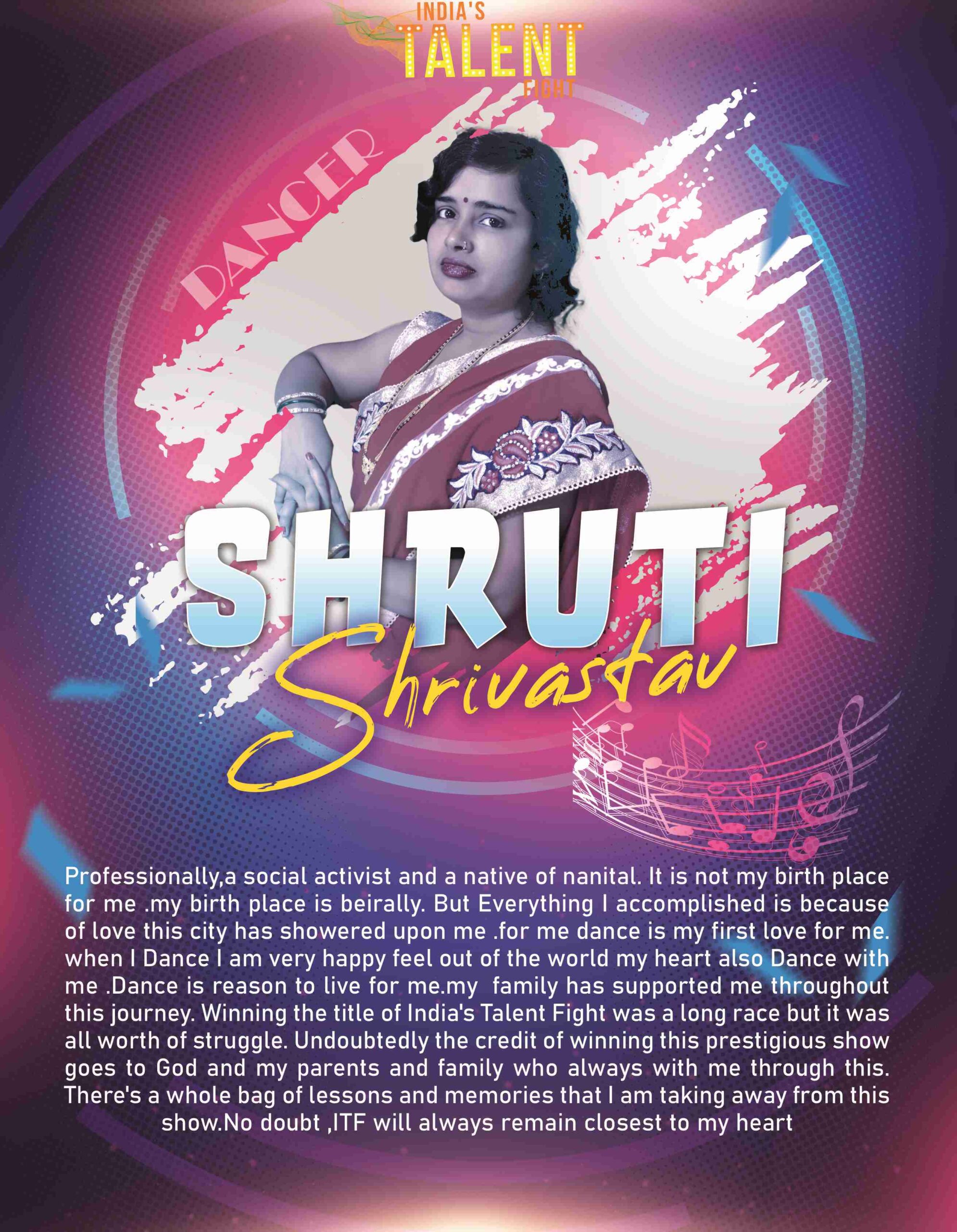SHRUTI SHRIVASTAV DANCER HALDWANIKeep learning success will find its way to youEverything is achievable when a person dedicates himself fully .I am shruti shrivastav professionally,a social activist and a native of nanital. It is not my birth place for me .my birth place is beirally. But Everything I accomplished is because of love this city has showered upon me .for me dance is my first love for me. when I Dance I am very happy