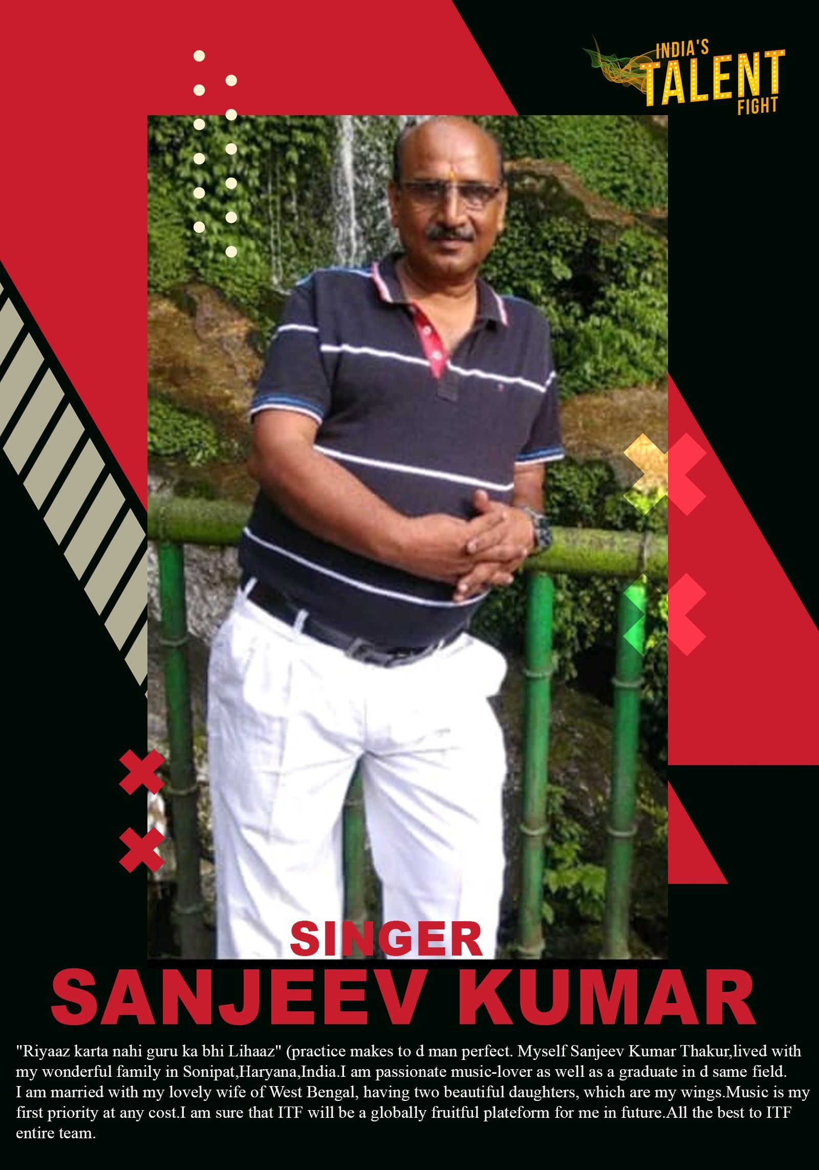 SINGER SANJEEV KUMAR SONIPAT “Riyaaz karta nahi guru ka bhi Lihaaz” (practice makes to d man perfect.Myself Sanjeev Kumar Thakur,lived with my wonderful family in Sonipat,Haryana,India.I am passionate music-lover as well as a graduate in d same field.I am married with my lovely wife of West Bengal, having two beautiful daughters, which are my wings.Music is my first priority at any cost.I am sure that ITF will be a globally fruitful plateform for me