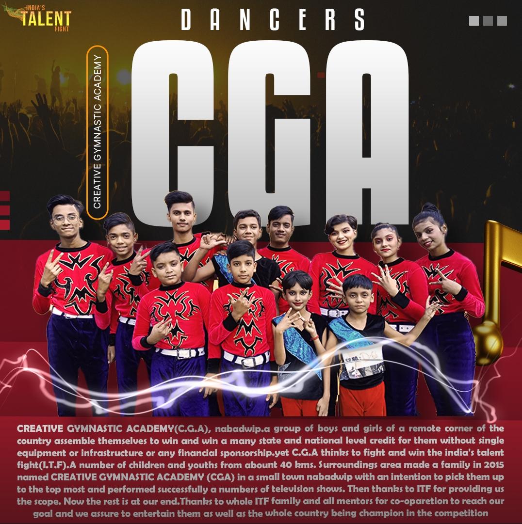 C.G.A. GROUP WEST BENGAL DANCERTRIUMPH STANDSONLY ON WILL POWERwhat we do- that we winIf you decicate yourself,you will succeed at last – that thinks CREATIVE GYMNASTIC ACADEMY(C.G.A), nabadwip.a group of boys and girls of a remote corner of the country assemble themselves to win and win a many state and national level credit for them without single equipment or infrastructure or any financial sponsorship.yet C.G.A thinks to fight and win the india’s talent fight(I.T.F).A number