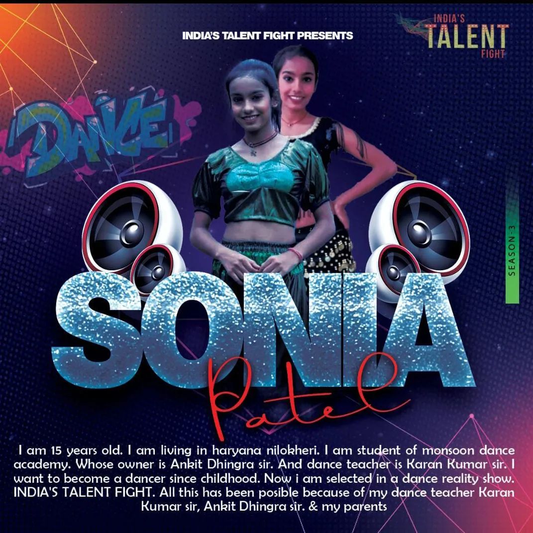 SONIA PATEL HARYANA DANCERMy name is soniya patel. I am 15 years old. I am living in haryana nilokheri. I am student of monsoon dance academy. Whose owner is Ankit Dhingra sir. And dance teacher is Karan Kumar sir. I want to become a dancer since childhood. Now i am selected in a dance reality show. INDIA’S TALENT FIGHT. All this has been posible because of my dance teacher Karan Kumar sir. Ankit Dhingra sir.