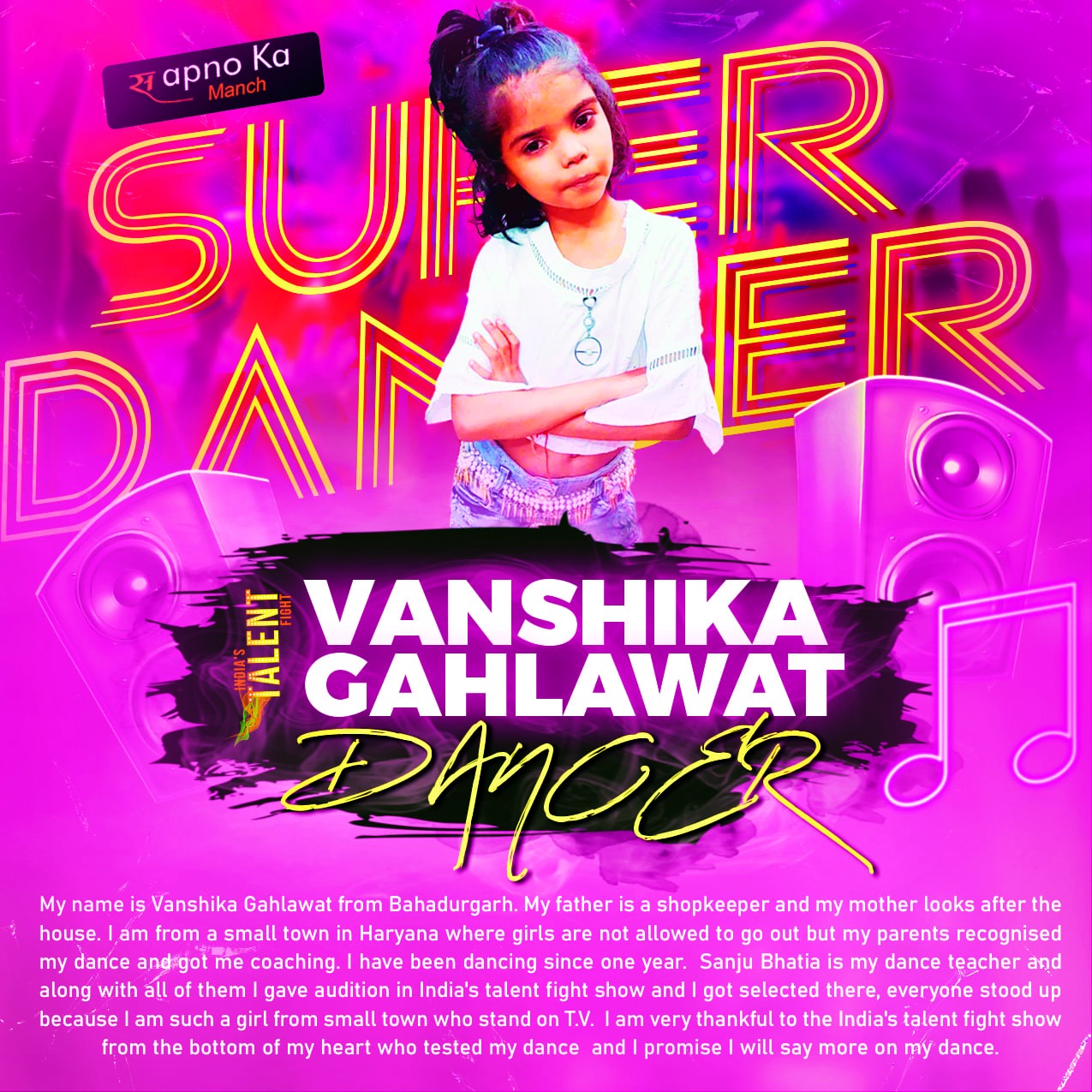 VANSHIKA BAHADURGARH DANCERMy name is Vanshika Gahlawat from Bahadurgarh. My father is a shopkeeper and my mother looks after the house. I am from a small town in Haryana where girls are not allowed to go out but my parents recognised my dance and got me coaching. I have been dancing since one year. Sanju Bhatia is my dance teacher and along with all of them I gave audition in India’s talent fight show and